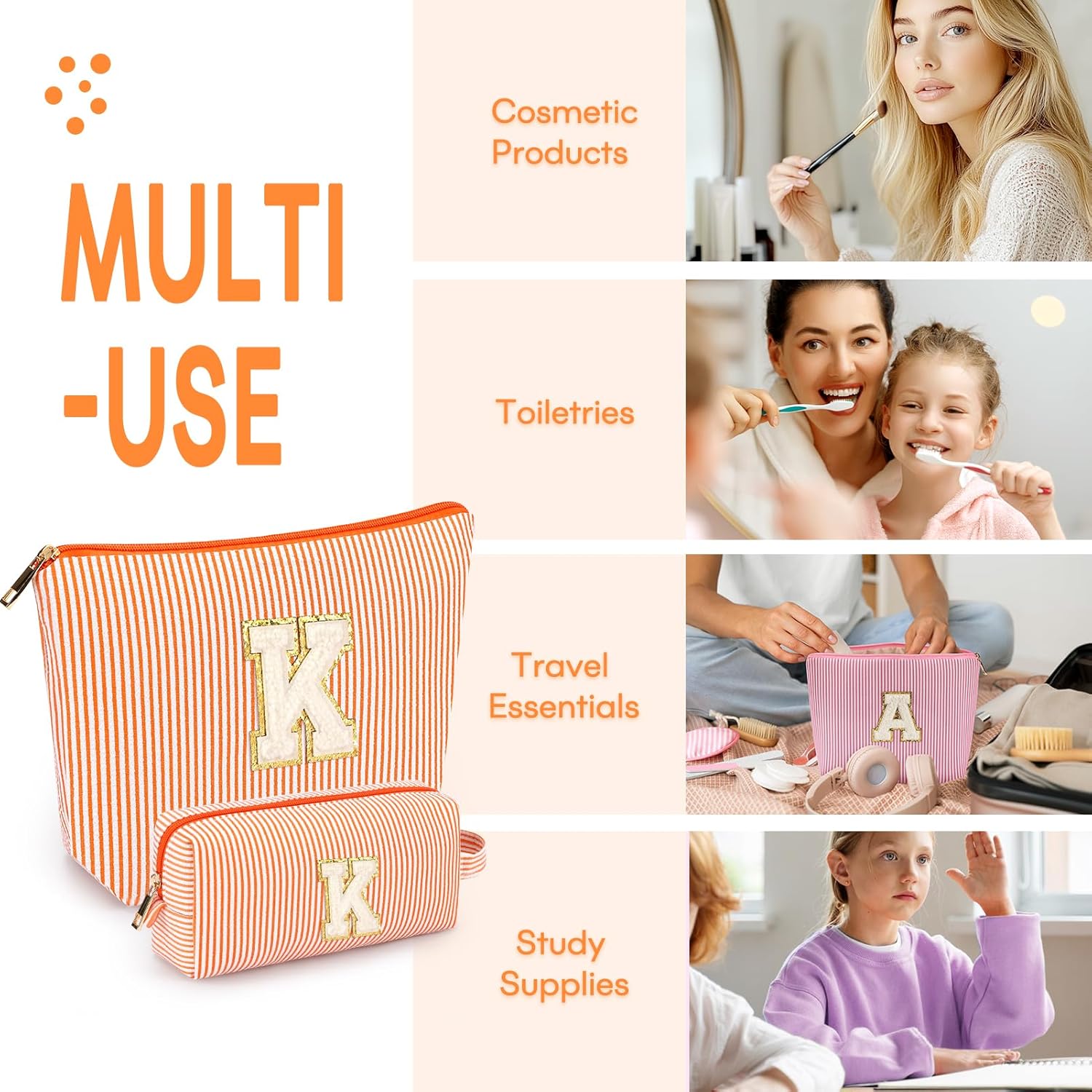 2 PCS Initial Makeup Bags for Women: Cosmetic Bag for Travel Toiletry - Birthday Gifts for 11 12 13 14 15 16 17 18 Years Old Girl Graduation Teacher Gift- Teen Girl Gifts Trendy Stuff - Orange K