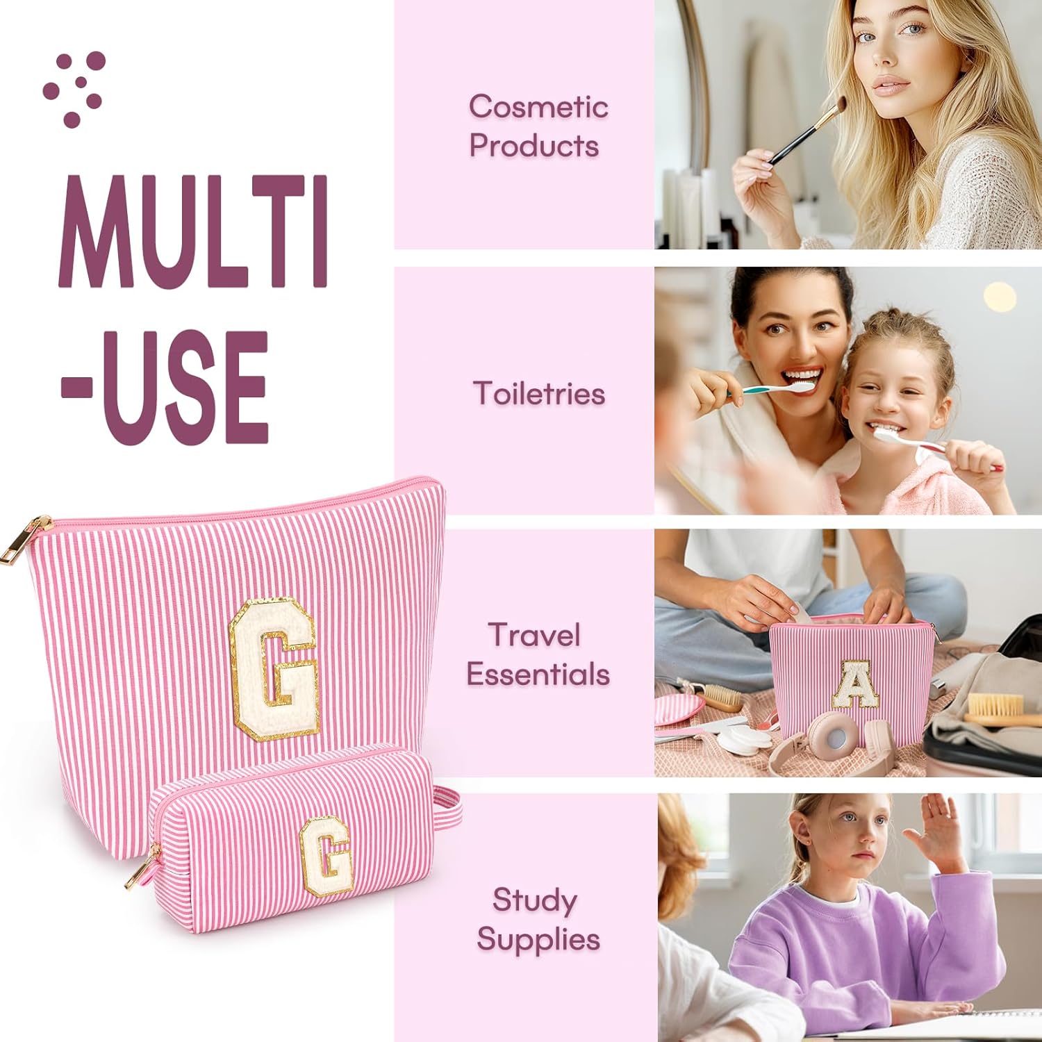2 PCS Initial Makeup Bags for Women: Cosmetic Bag for Travel Toiletry - Birthday Gifts for 11 12 13 14 15 16 17 18 Years Old Girl Graduation Teacher Gift- Teen Girl Gifts Trendy Stuff - Pink G