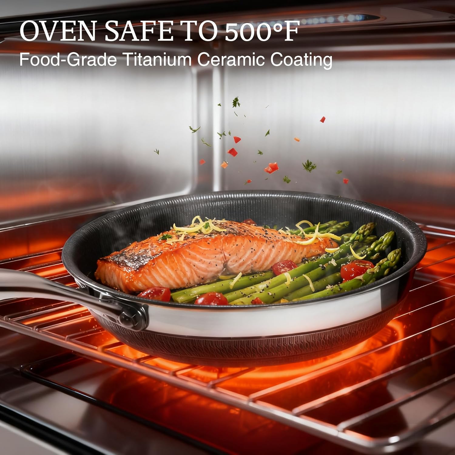 • 5-Layer Structure : The stainless steel frying pan features a nonstick titanium ceramic interior, a 4mm extra-thick aluminum core, and a dual-layer 403 stainless steel design, ensuring rapid and even heat distribution along with outstanding durability. The outer star-trail etched layer prevents yellowing caused by flames and stains. Its five-layer structure locks in heat, preserving flavors and textures for an exceptional cooking experience.