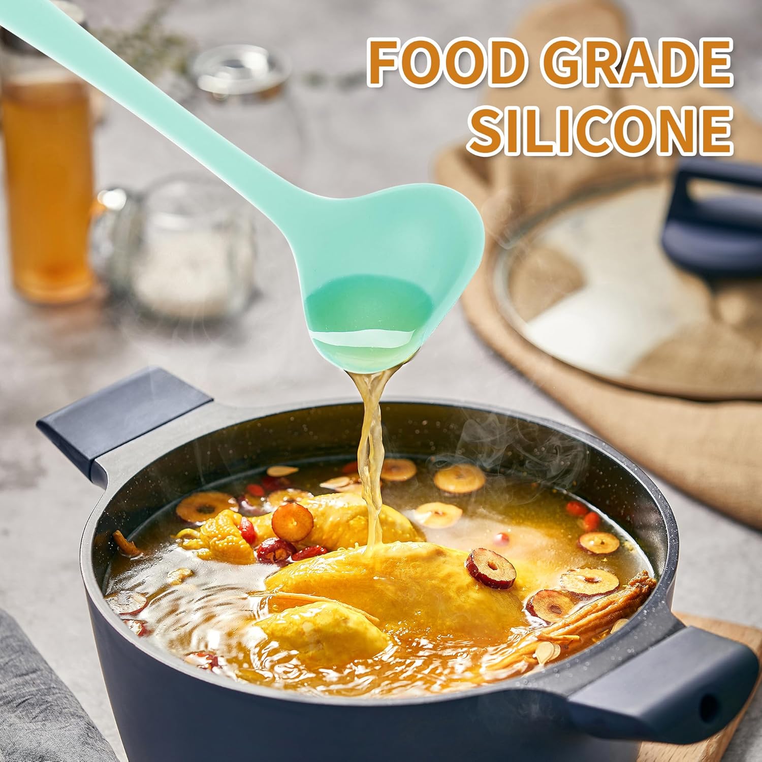 • ESSENTIAL KITCHEN TOOLS: Include Slotted spoon, Solid spoon, Soup ladle, Slotted turner, Solid turner, Spaghetti spoon, Spatula, Tongs, Whisk, Silicone mat, Basting brush(ALL Silicone) + Plastic Egg separator and Measuring spoon. Meet all kinds of kitchen needs. From beginners to skilled cooks.