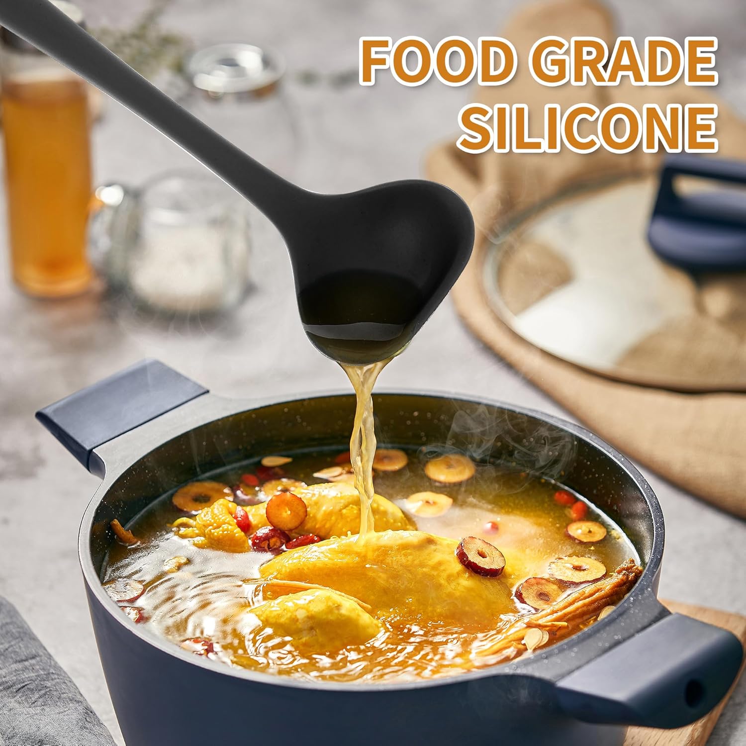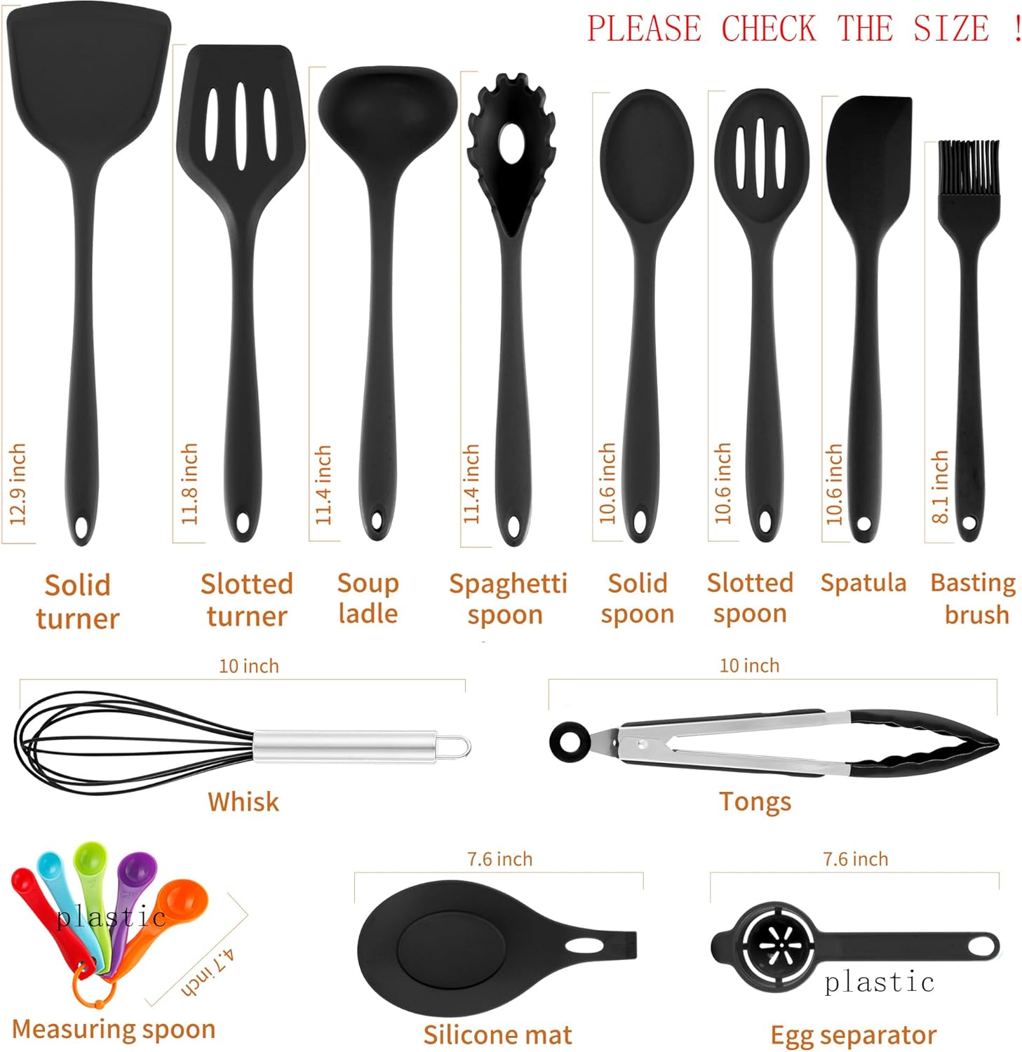 • ESSENTIAL KITCHEN TOOLS: Include Slotted spoon, Solid spoon, Soup ladle, Slotted turner, Solid turner, Spaghetti spoon, Spatula, Tongs, Whisk, Silicone mat, Basting brush(ALL Silicone) + Plastic Egg separator and Measuring spoon. Meet all kinds of kitchen needs. From beginners to skilled cooks.