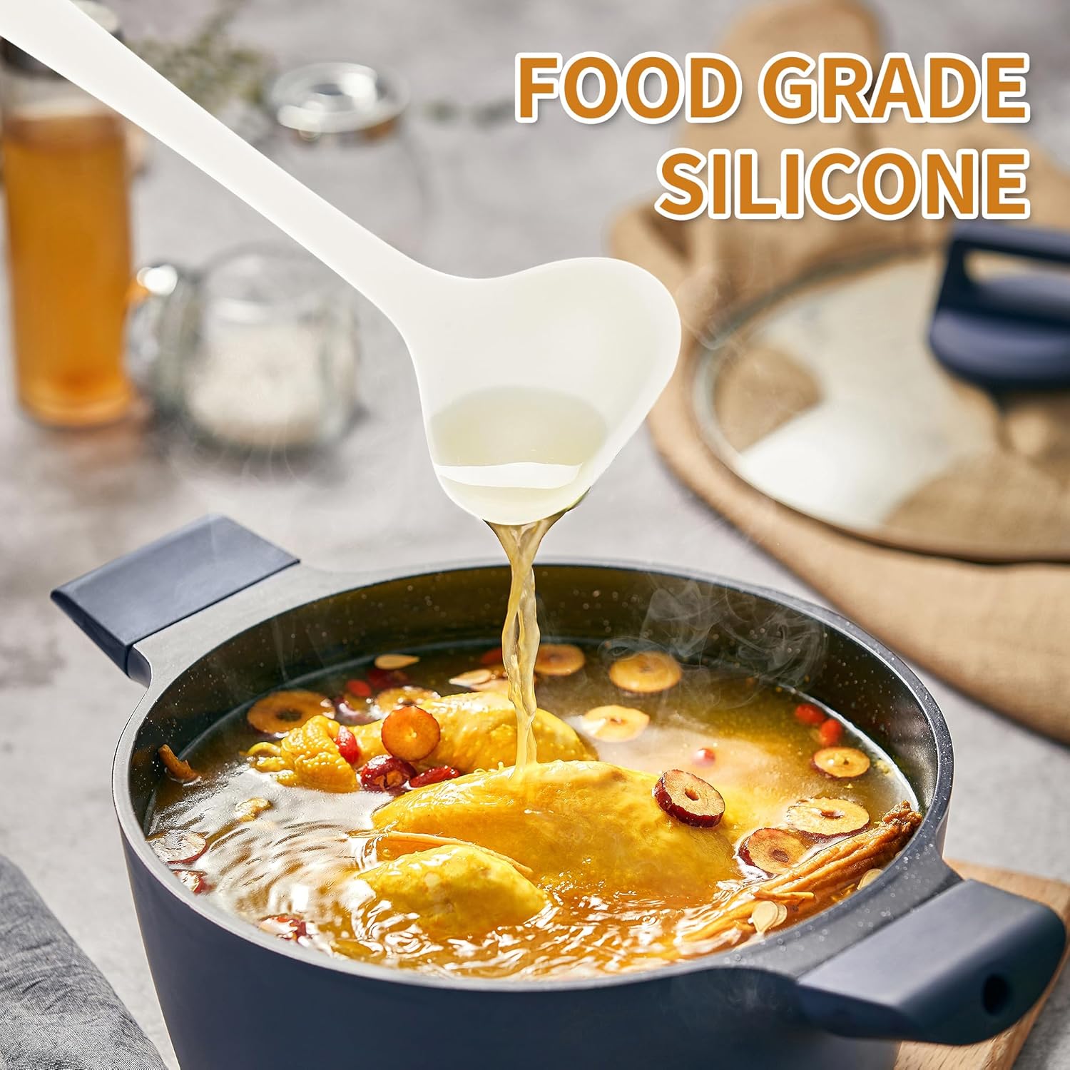 • ESSENTIAL KITCHEN TOOLS: Include Slotted spoon, Solid spoon, Soup ladle, Slotted turner, Solid turner, Spaghetti spoon, Spatula, Tongs, Whisk, Silicone mat, Basting brush(ALL Silicone) + Plastic Egg separator and Measuring spoon. Meet all kinds of kitchen needs. From beginners to skilled cooks.