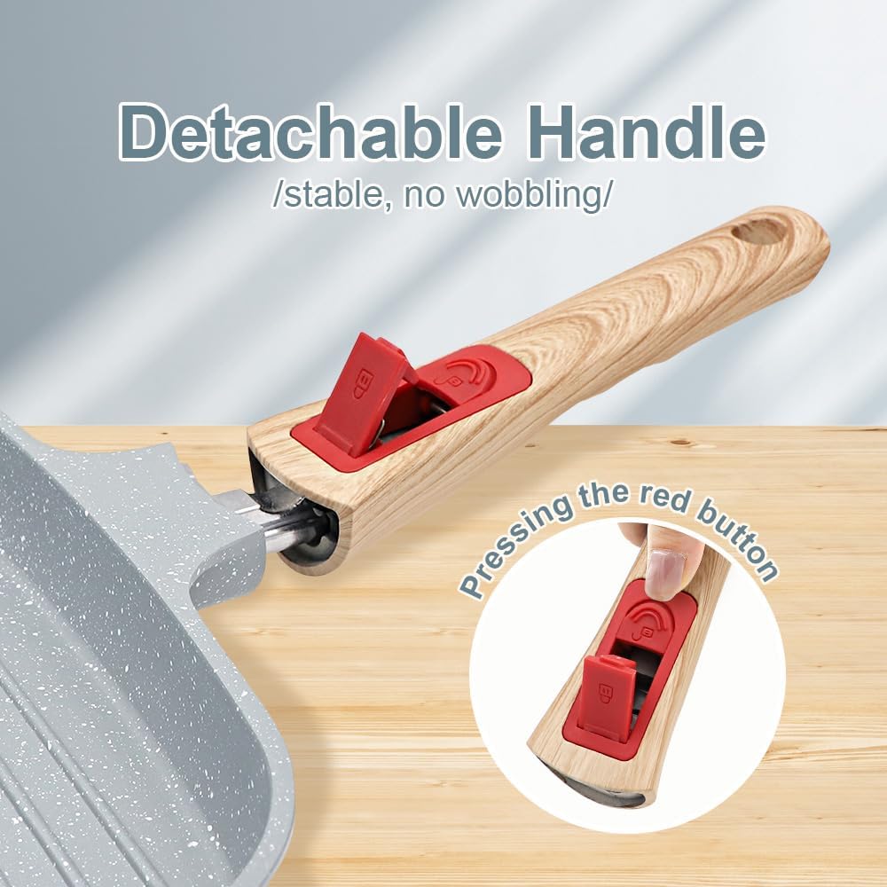 • PREMIUM MATERIAL - The grill pan is made of high quality aluminum, which can provide exceptional heat retention and distribution than traditional cast iron pan. The detachable handle is made of bakelite, which has good property of heat insulation and protects you from being burnt.