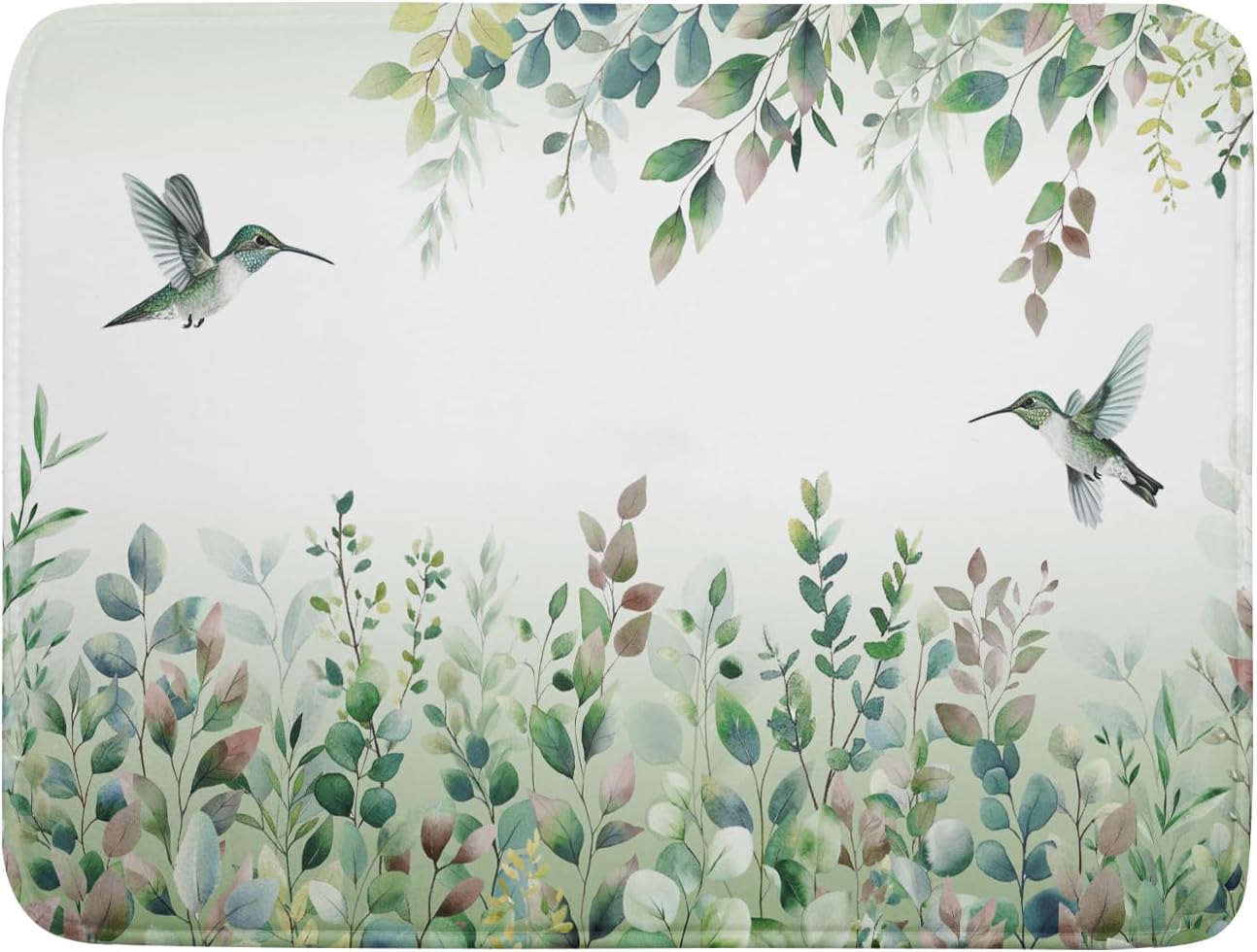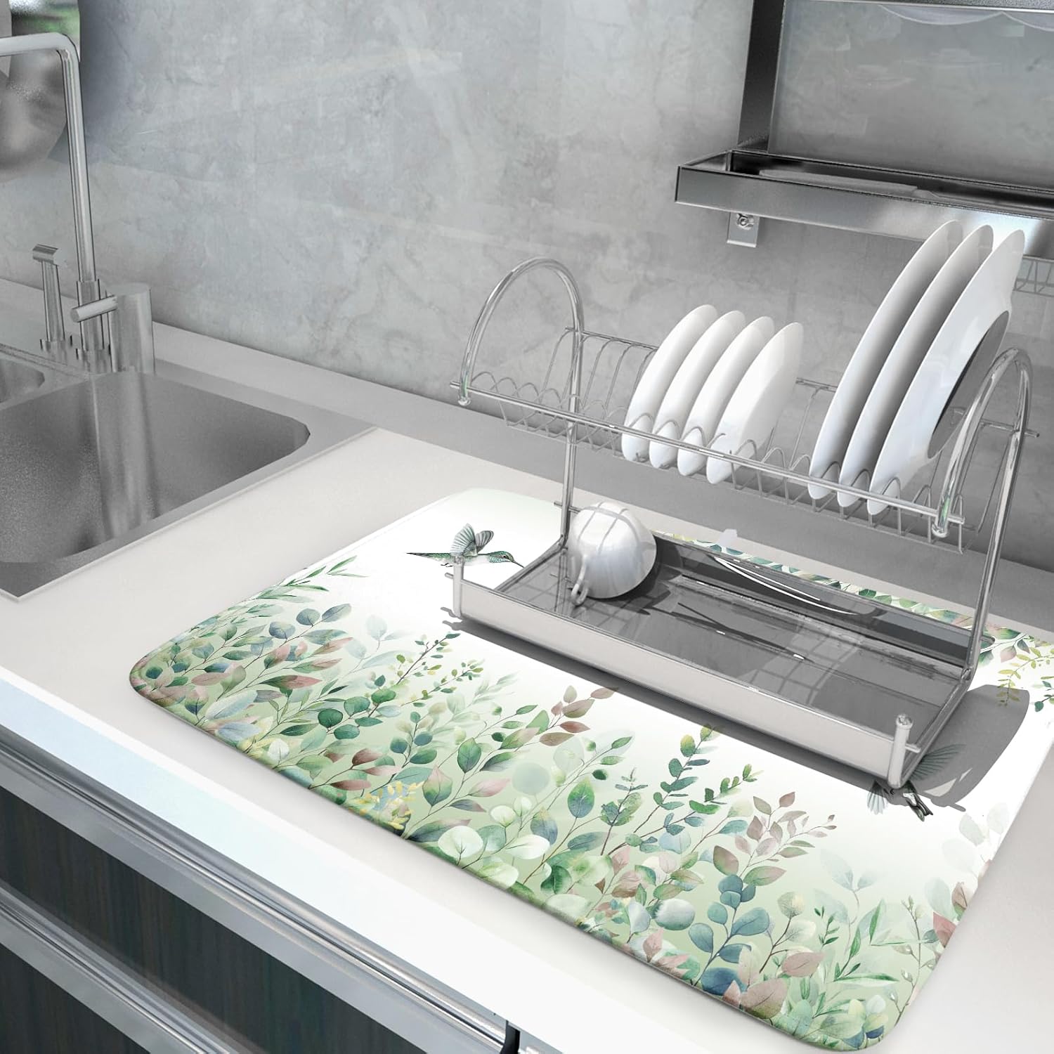 Giwawa Hummingbird Dish Drying Mat for Kitchen Countertop, Spring Summer Sage Green Eucalyptus Leaves Dish Drainer Mats, Herb Botanical Microfiber Dish Drying Pad Home Decor, 18"x24", Large