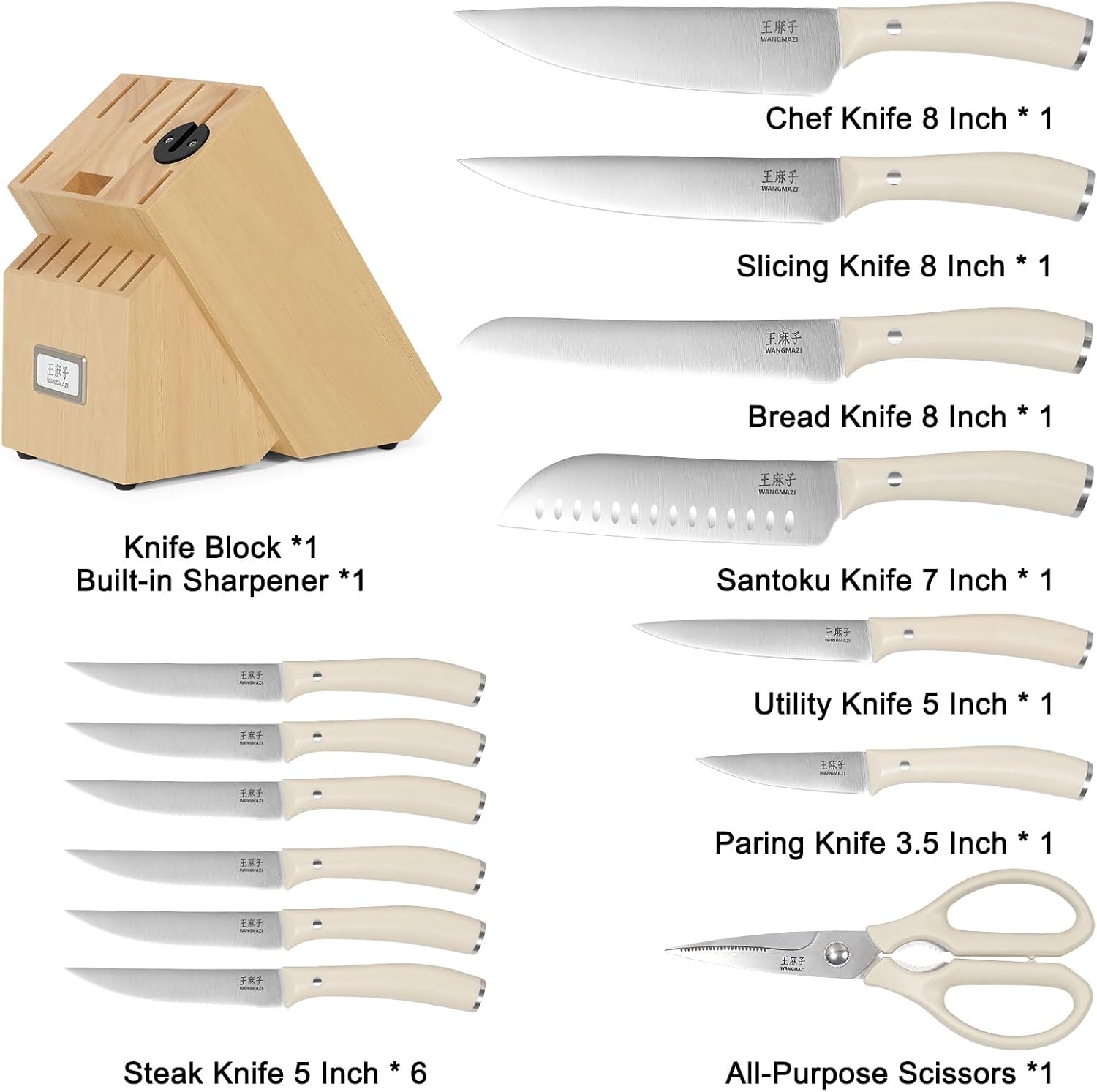 • High Value Knife Set:WANGMAZI knife set includes 8"chef knife,8"slicing knife,8"santoku knife,8"bread knife,5.5"paring knife,5"fruit knife,6*3.5"steak knives,kitchen scissors and a wooden knife holder.