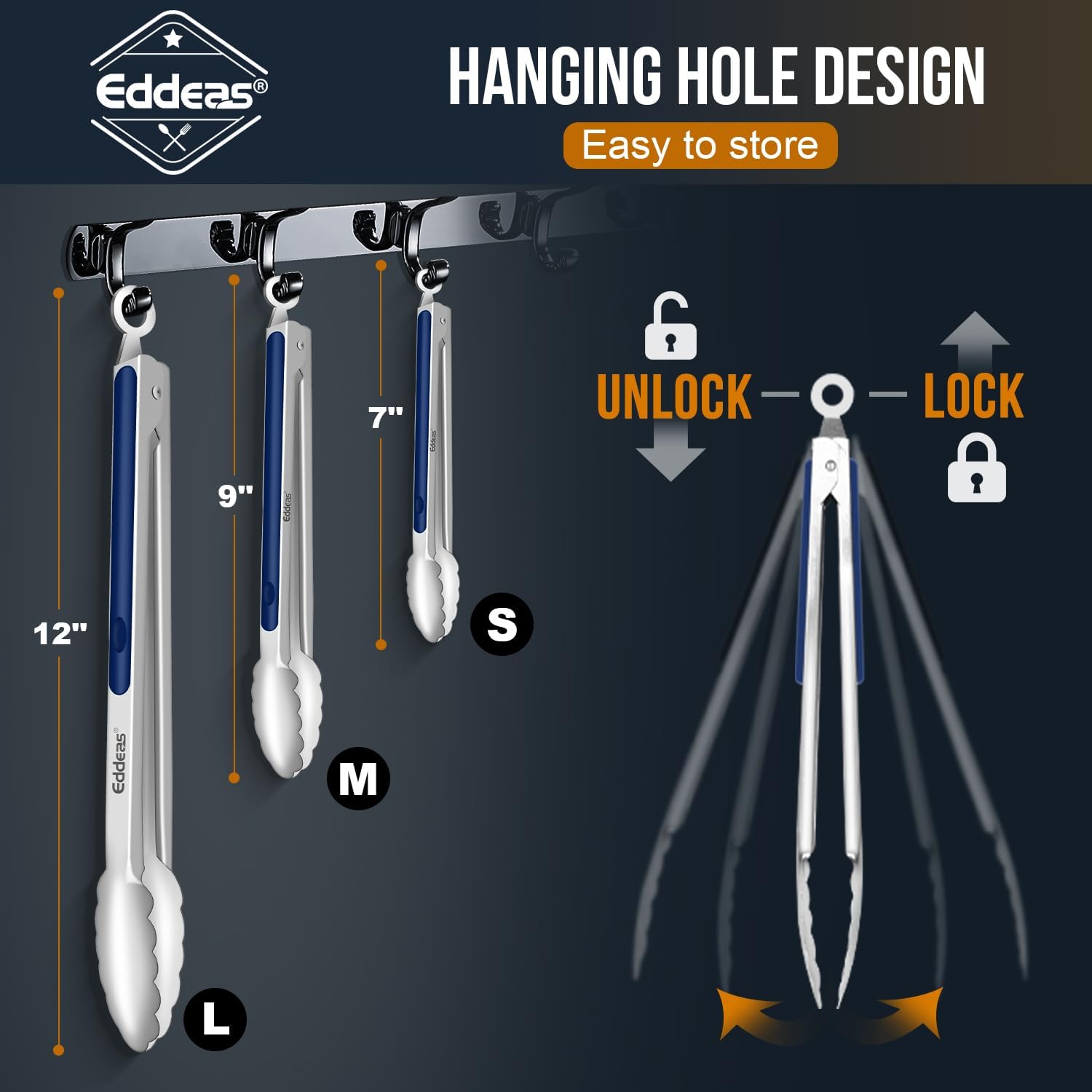 • MULTIPLE APPLICATION - Perfect for everyday kitchen tasks or outdoor use, whether you use them as cooking tongs , salad tongs, grill tongs, need reliable Heavy Duty Metal KitchenTongs for Cooking to grab food from boiling water, or as a grill Turner or salad server, EDDEAS tongs will meet your needs for safety and stability Size: 7in + 9in + 12in Set of 3 blue