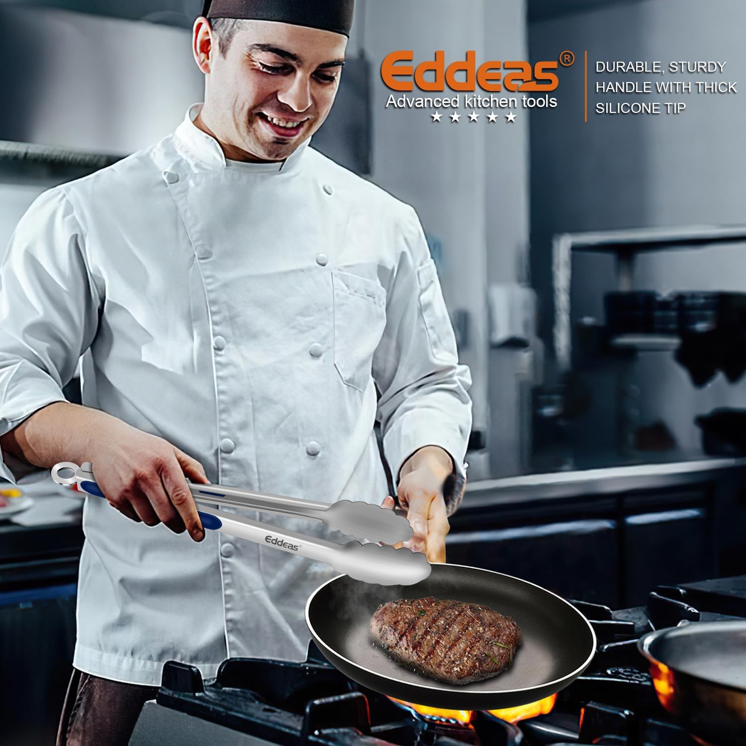 • FOOD-GRADE STAINLESS STEEL COOKING TONGS - Eddeas kitchen tongs for cooking are made of 1mm thick food-grade stainless steel in one piece for enhanced robustness and heat resistance, rust resistance and easy handling. The overall light weight and ergonomic features are maintained.