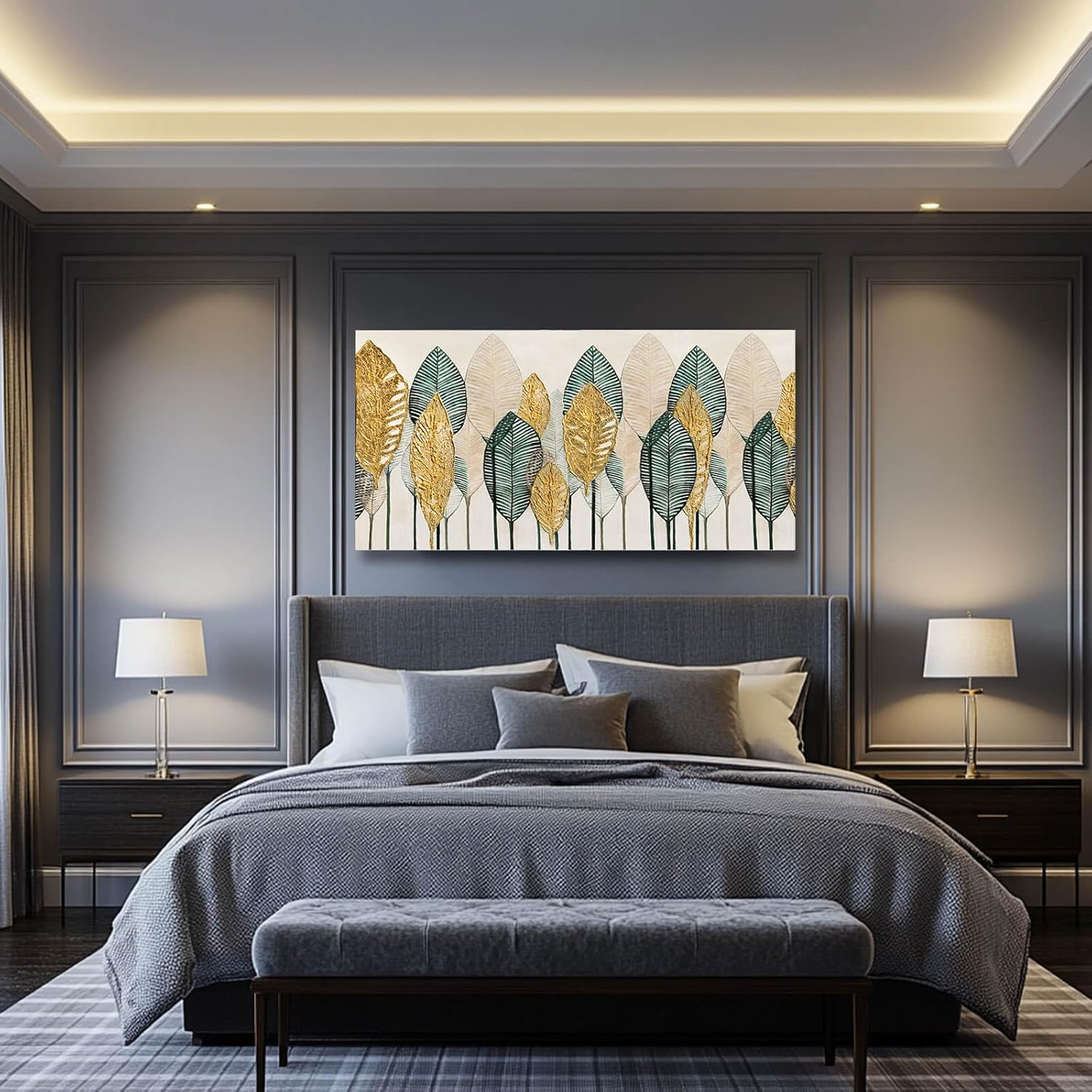 CHUDANHAO Green Wall Art Gold Wall Decor Leaves Prints Pictures Textured Bedroom Decor Line Painting Green Paintings Wall Decorations 24”x48” Artwork for Living Room Dining Room