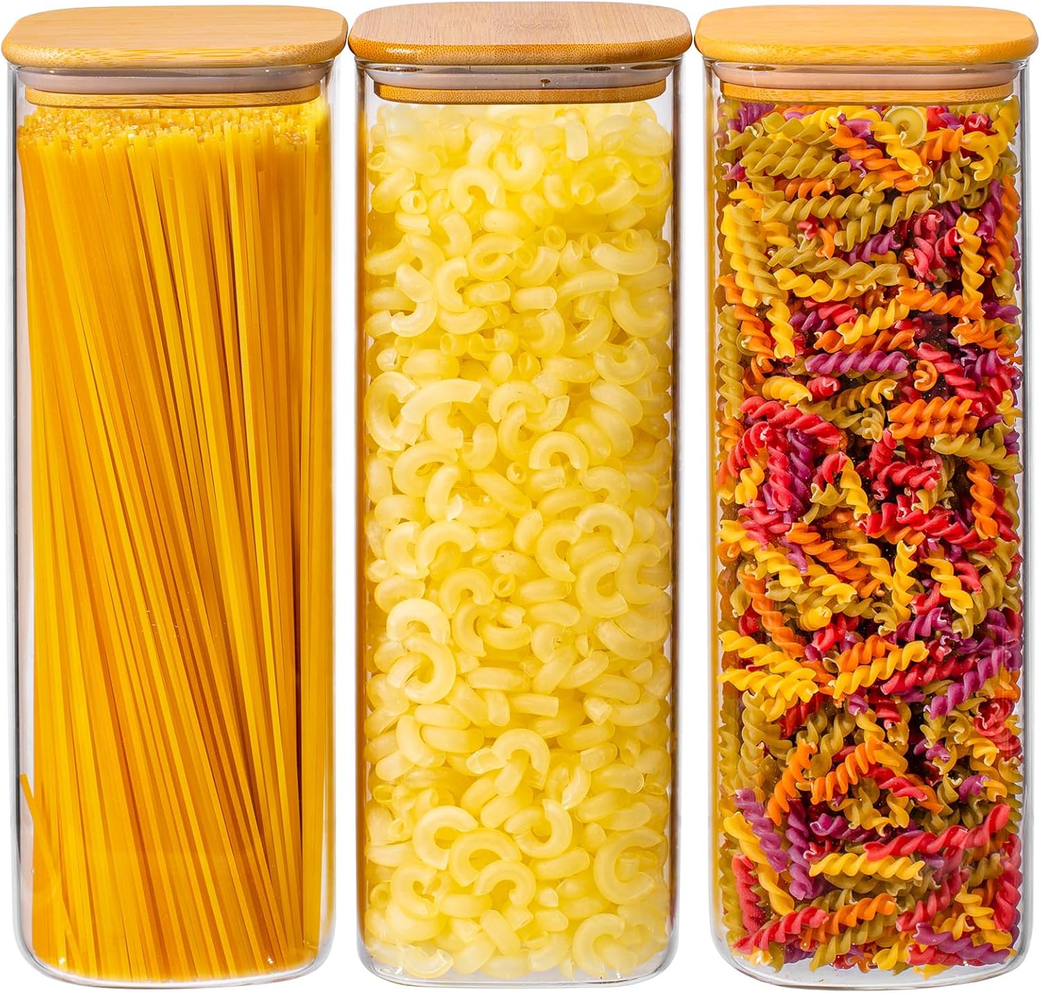 73oz 3PCS Sqaure Spaghetti Pasta Storage Containers with Lids, Pantry Containers Tall Glass Tight Food Storage Jars with Lids for Penne, Macaroni, Lasagna, Fusilli, Cereal, Flour, Sugar, Oats