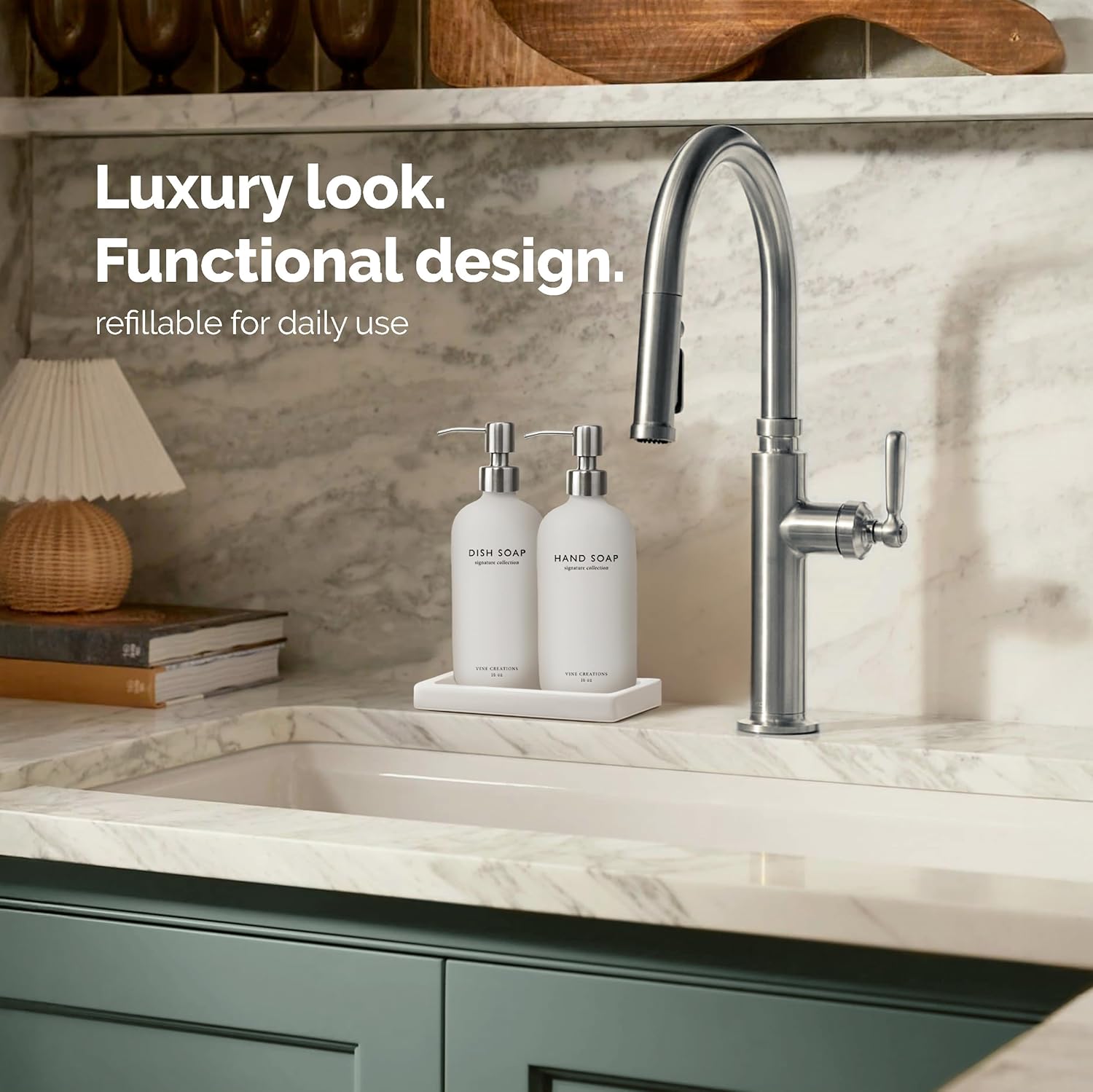• STYLE YOU CAN FEEL – Heavier than standard dispensers, this hand and dish soap dispenser set of 2 brings substance to your countertop. Built to last and made to impress—with a matching ceramic tray that keeps your set tidy, stylish, and perfectly organized.