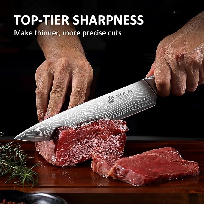 • HIGH CARBON STEEL: YOTSUBA kitchen chef knife is made of high-carbon stainless steel engineered to perfection at 56+ Rockwell hardness for long lasting performance, rust and stain resistant