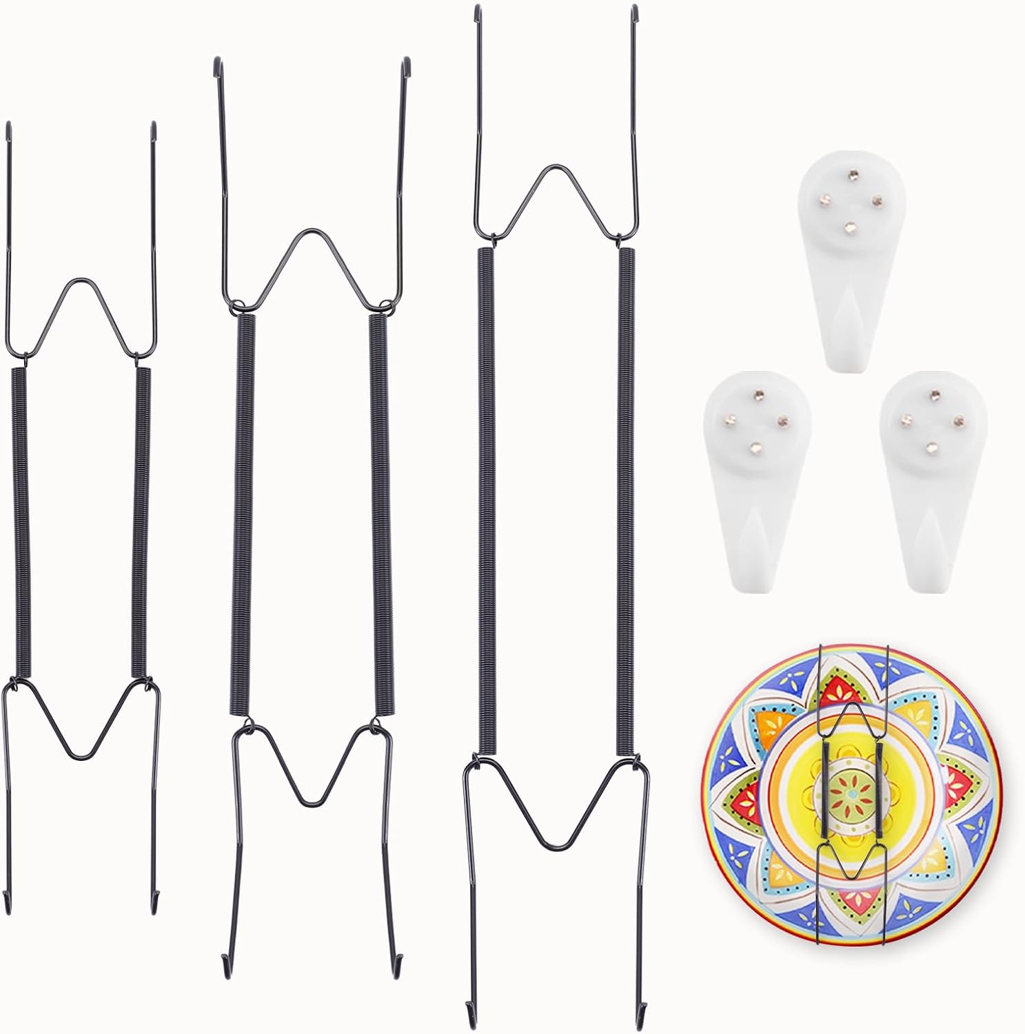 • 【Plate Hangers for The Wall】 You will receive 3 plate hangers in 3 sizes: 1 pcs for 10"-14" plates、1 pcs for 10"-16" plates、1 pcs for 11"-20" plates. Included accessories: 3 wall hooks、12 rubber tip protectors (4 per hanger)、1 instruction manual. Safety Note: These hangers have spring-loaded clamps—handle with care to avoid pinching your fingers.