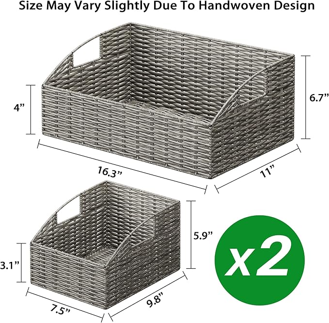 • STURDY AND DURABLE: The durable wicker storage bins are hand-woven by seasoned artisans over a rugged iron frame. The wicker storage baskets can be used for a long time without deformation. Simple and easy to clean the pantry baskets, all you need to do is wipe it with a damp cloth.