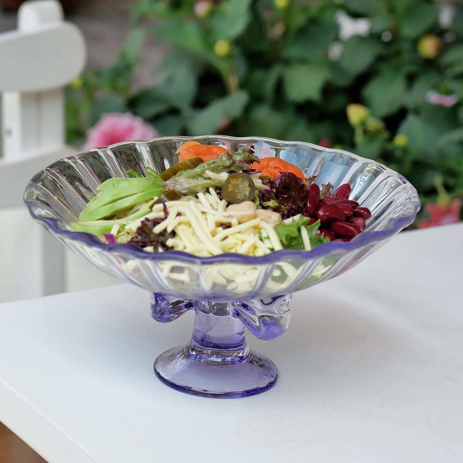 Glass Fruit Bowl. 9 inch Glass Pedestal Bowl. Elegant Bow Decoration Multicolor Salad Plate. Suitable for Fruit, Dessert, Candy, Snack & More. (Purple)