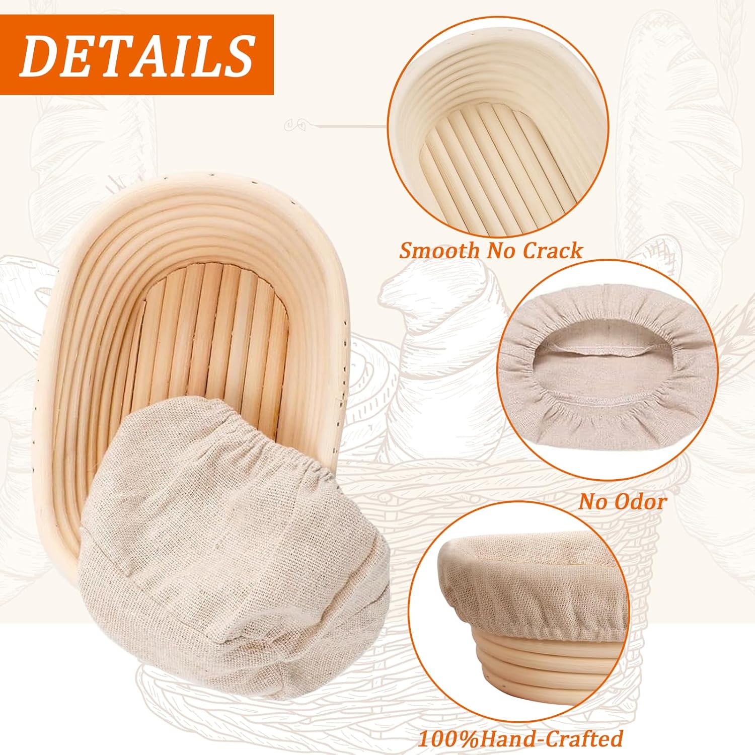 • 【Set of 5 Oval Banneton Bread Proofing Baskets】This set includes four 6-inch oval banneton baskets with liners, perfect for sourdough and artisan bread baking. Made with natural rattan, these proofing baskets help shape and ferment dough for beautiful, bakery-style results.