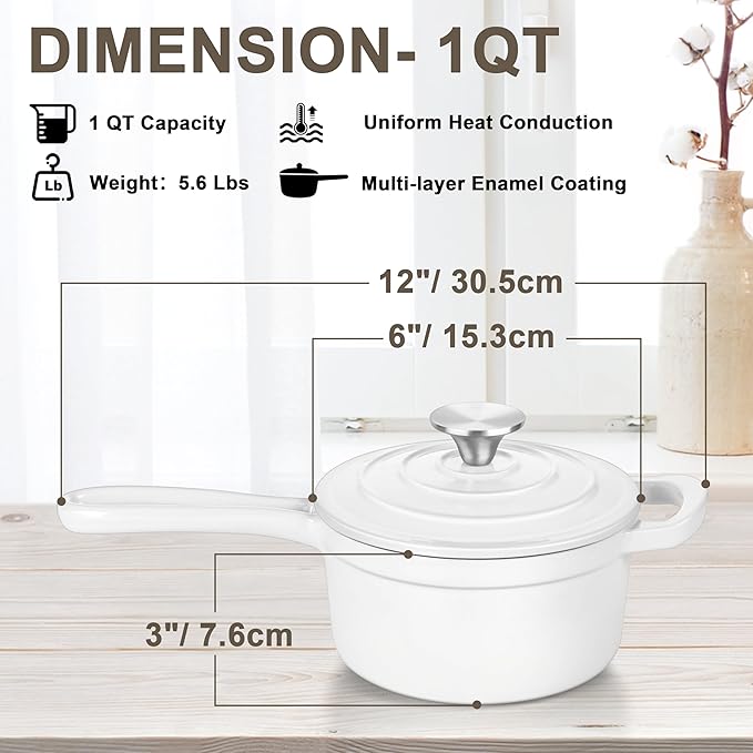 • CAPACITY & SIZE, our 1 quart cast iron dutch oven is suitable for 1-2 people and measures 12" x 6" x 4.3" overall, perfect for making a variety of sauces, soups, milk and vegetables. After using the pan, you need to wear gloves to move the sauce pan to avoid burns