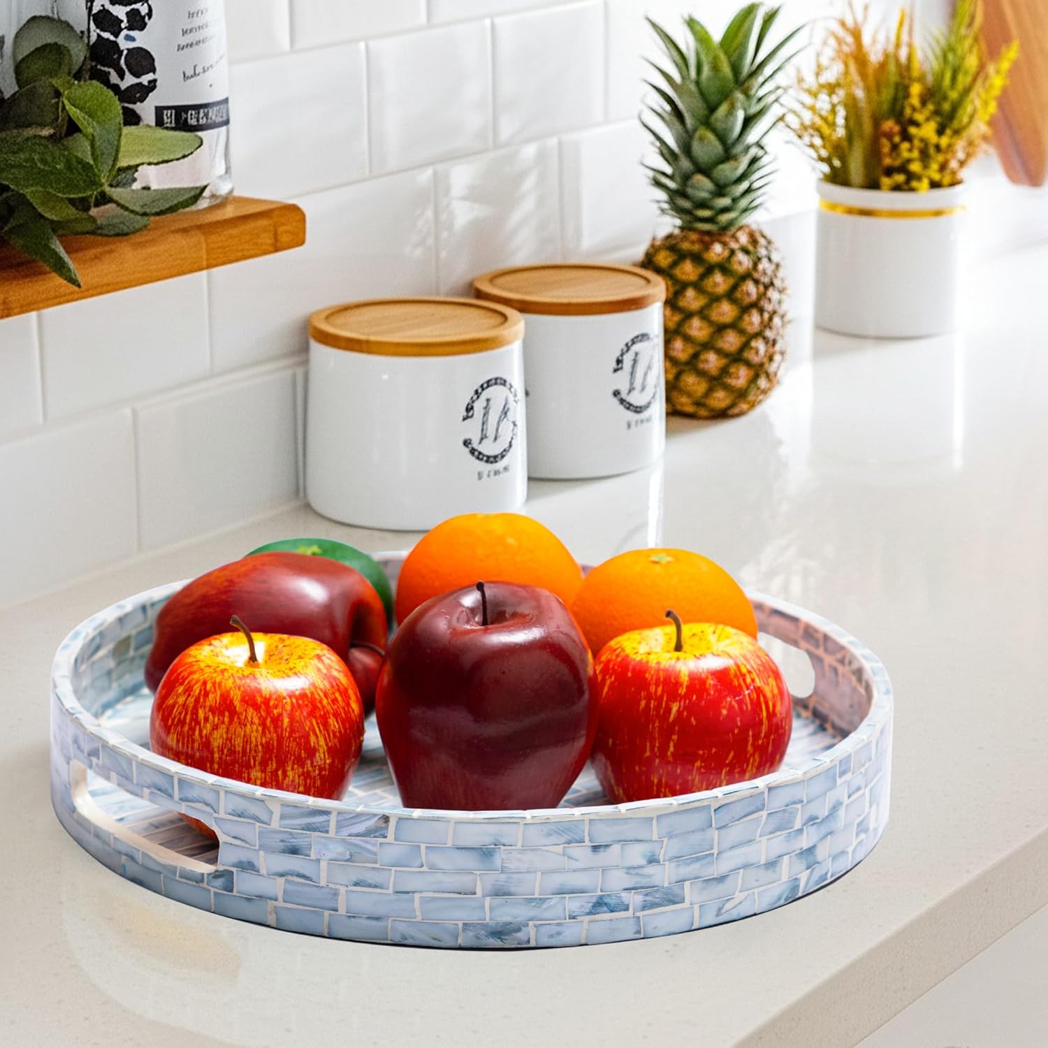 CLAYNIX Serving Tray 12.5 Inch, Wooden Lacquer Tray with Mother of Pearl Inlay, Elegant Tea & Breakfast Tray with Handles (Round)