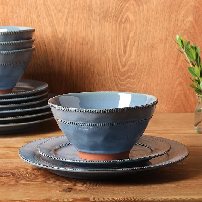 Gibson Elite Terranea 12 Piece Dishes Reactive Glaze Plates and Bowls Terracotta Dinnerware Set - Service for 4 - Blue