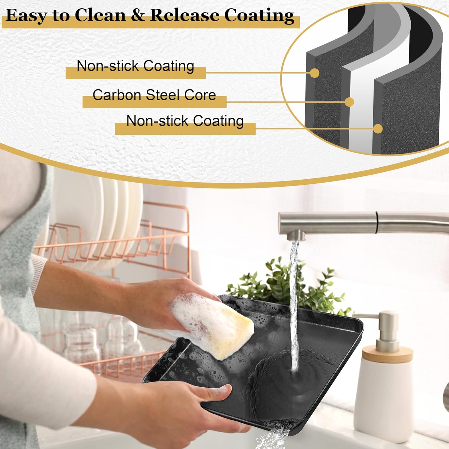 • MAKE CLEANING A BREEZE: One-piece design metal baking tray with smooth surface and no rough spot, Round corner with no dead end make baked food come out perfectly and completely, Non-stick coating can easily release food and no more concerns in food sticking problem, Can easily rub the dirty away, Dishwasher safe for effortless, Recommend to wash by hand for longer service life