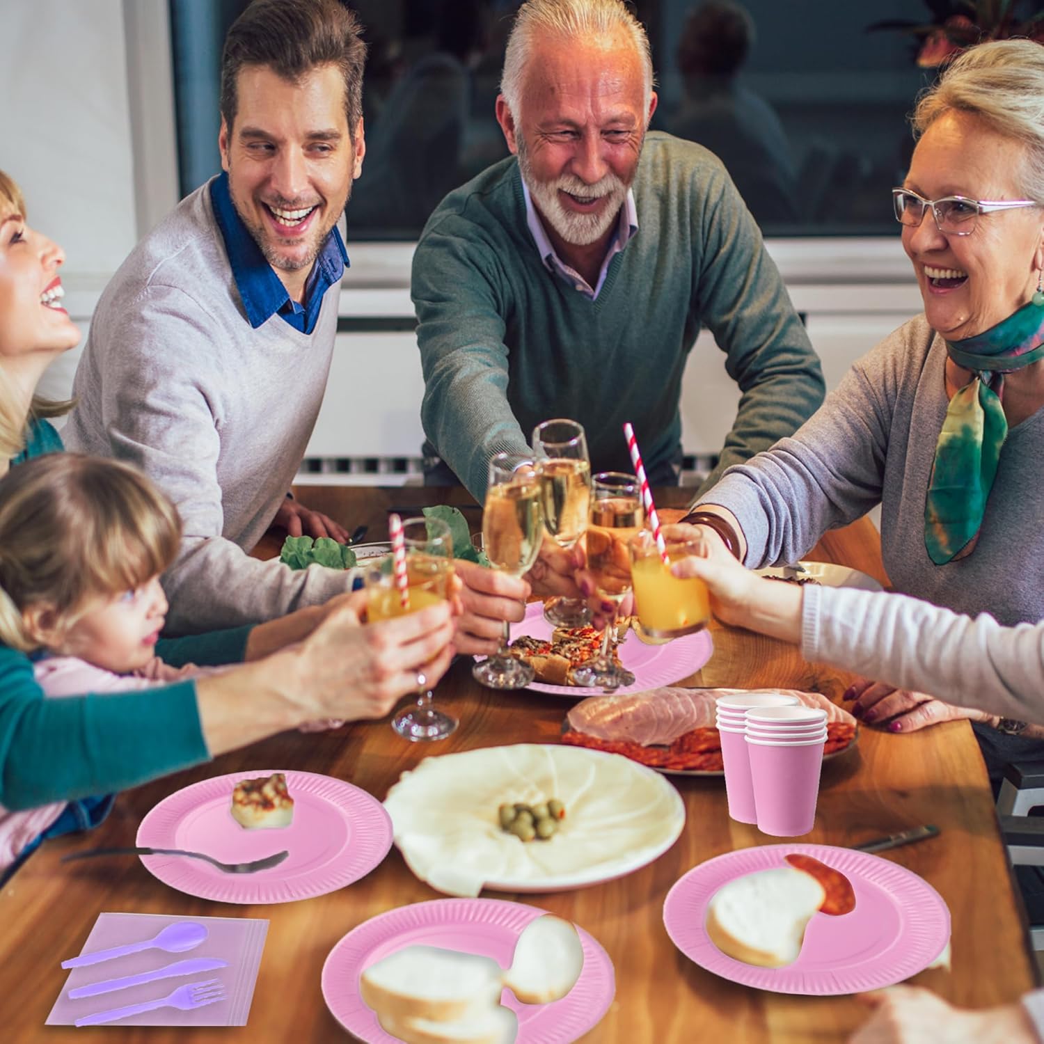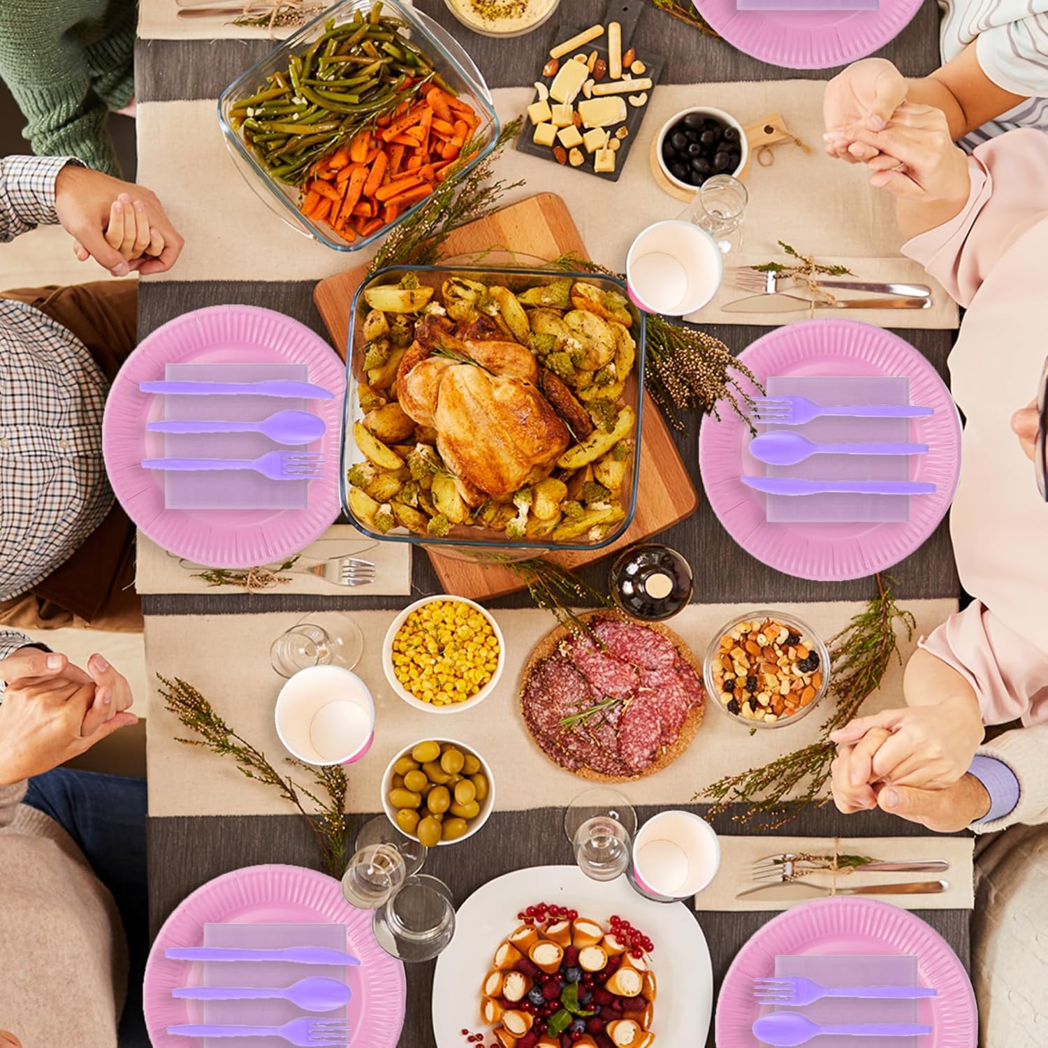 • Light Purple Party Supplies Set: Includes 30 × 9-inch paper dinner plates, 30 × 7-inch dessert paper plates, 30 × 9-ounce paper cups, 30 napkins, knives, forks and spoons × 30 each (210 pieces in total), perfect for desserts, cookies, cakes, small fruits, etc. Meet your different holiday party needs