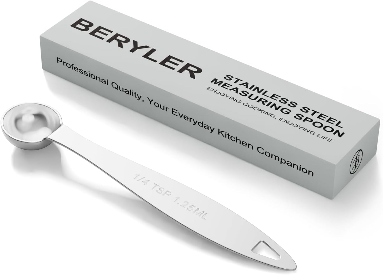 • Precise Scales: The BERYLER measuring spoon is so precise that it can be the perfect partner for your cooking. The teaspoon has a clear scale on the handle in US and metric. ⬤1/4 TSP | 1.25ML