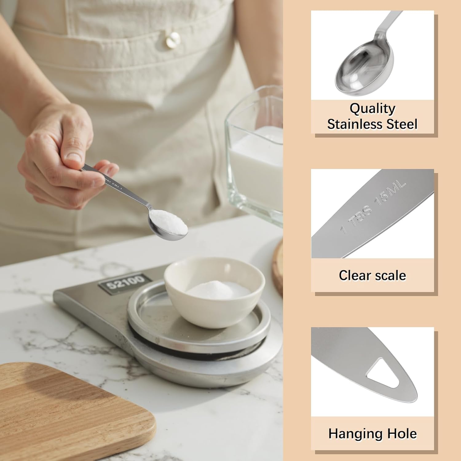 • Excellent Quality: The metal measuring spoons are designed for a lifetime of use which is durable and sturdy. Made of food-grade stainless steel, won’t fade or rub off, free of toxins and chemicals. Once you have them, you may throw away the other measuring spoons