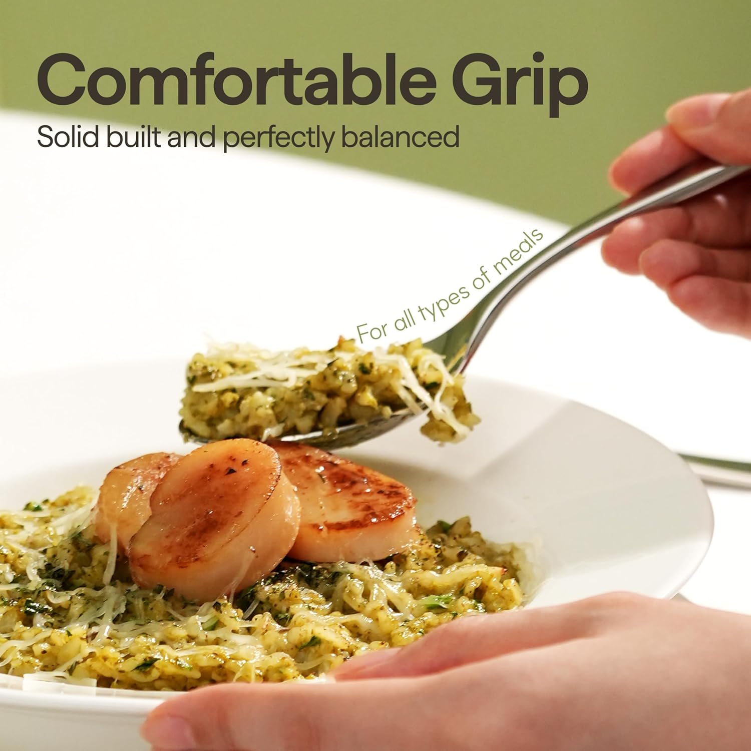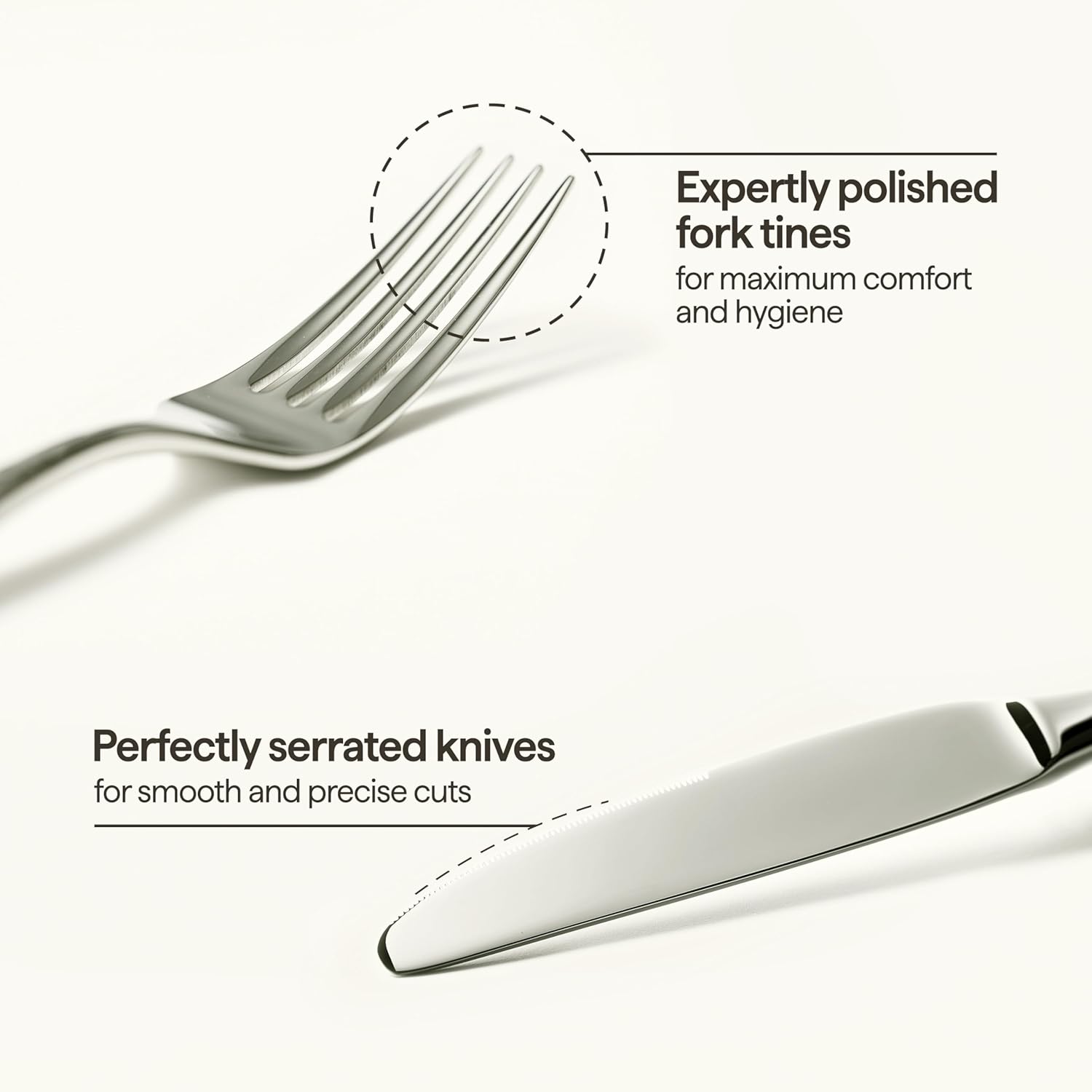 • Designed for Comfort & Precision: Experience an elegant and well-balanced kitchen flatware set crafted with the optimal thickness for a sturdy, premium feel. The smooth, rounded edges ensure a comfortable grip, while the precisely serrated dinner knives offer effortless cutting, making every meal feel like a fine dining experience.