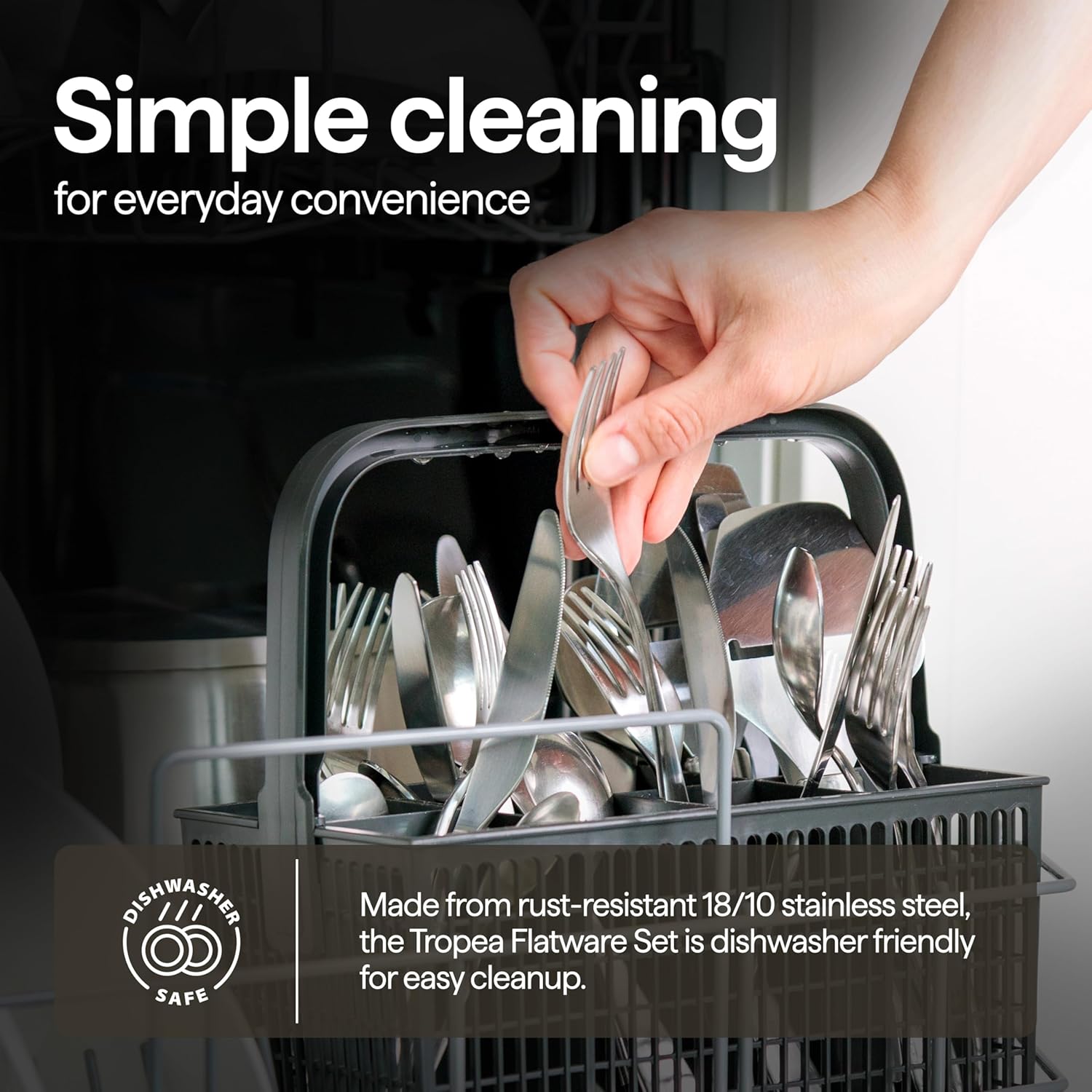 • Dishwasher Safe & Built to Last: Made for convenience, this 18/10 stainless steel silverware set is dishwasher safe and retains its beautiful shine wash after wash, eliminating the burden of handwashing.