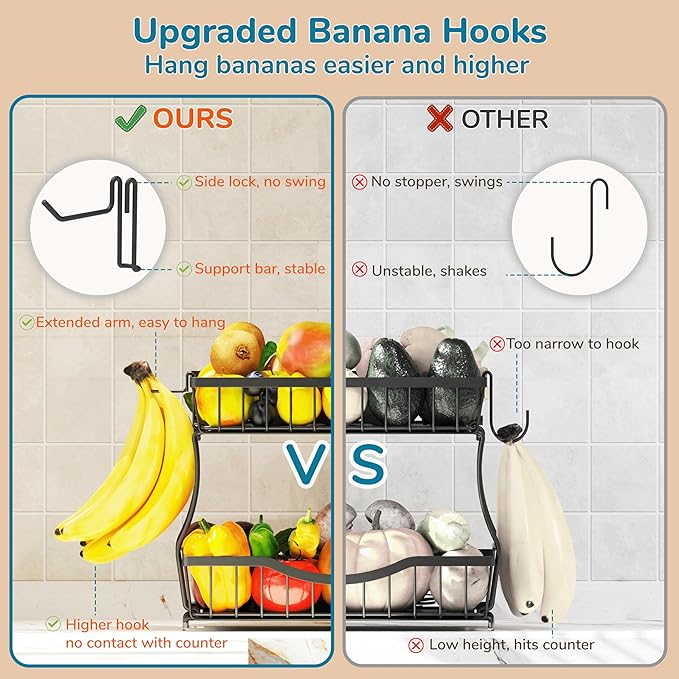 • Banana Hangers: Includes two detachable banana hooks for natural, organized hanging