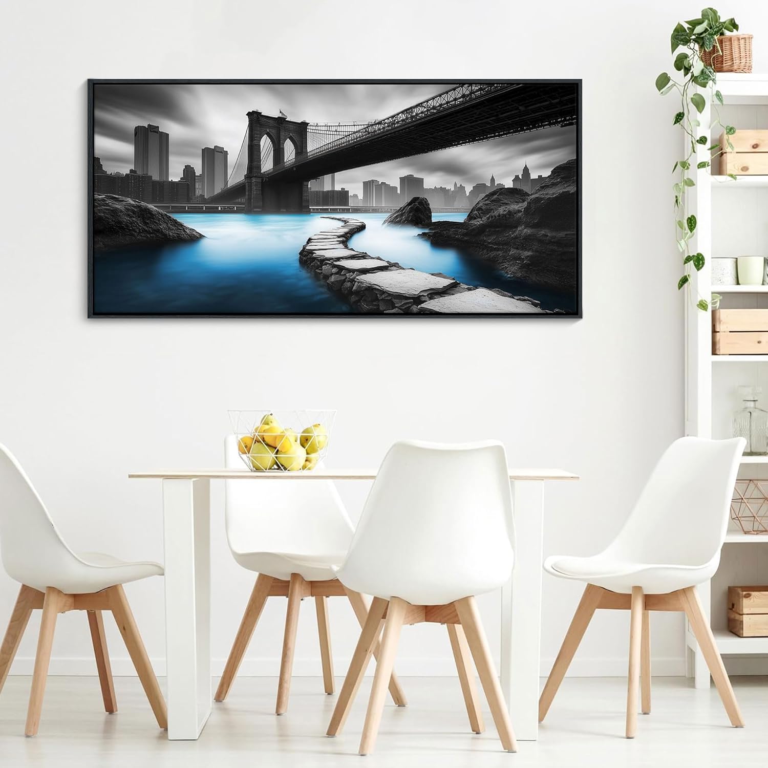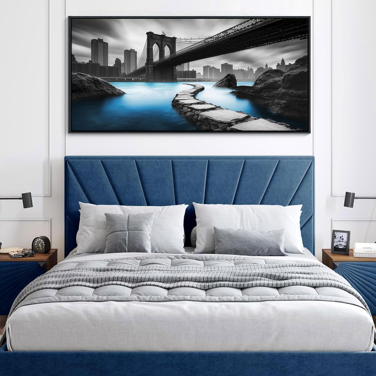 • Iconic Urban Monochrome Drama: Celebrate New York’s timeless landmark with bold black and white wall art that commands attention. The striking blue water accents under the bridge add a modern twist, making this large wall art a conversation-starting paintings wall decor for your wall art for living room or office