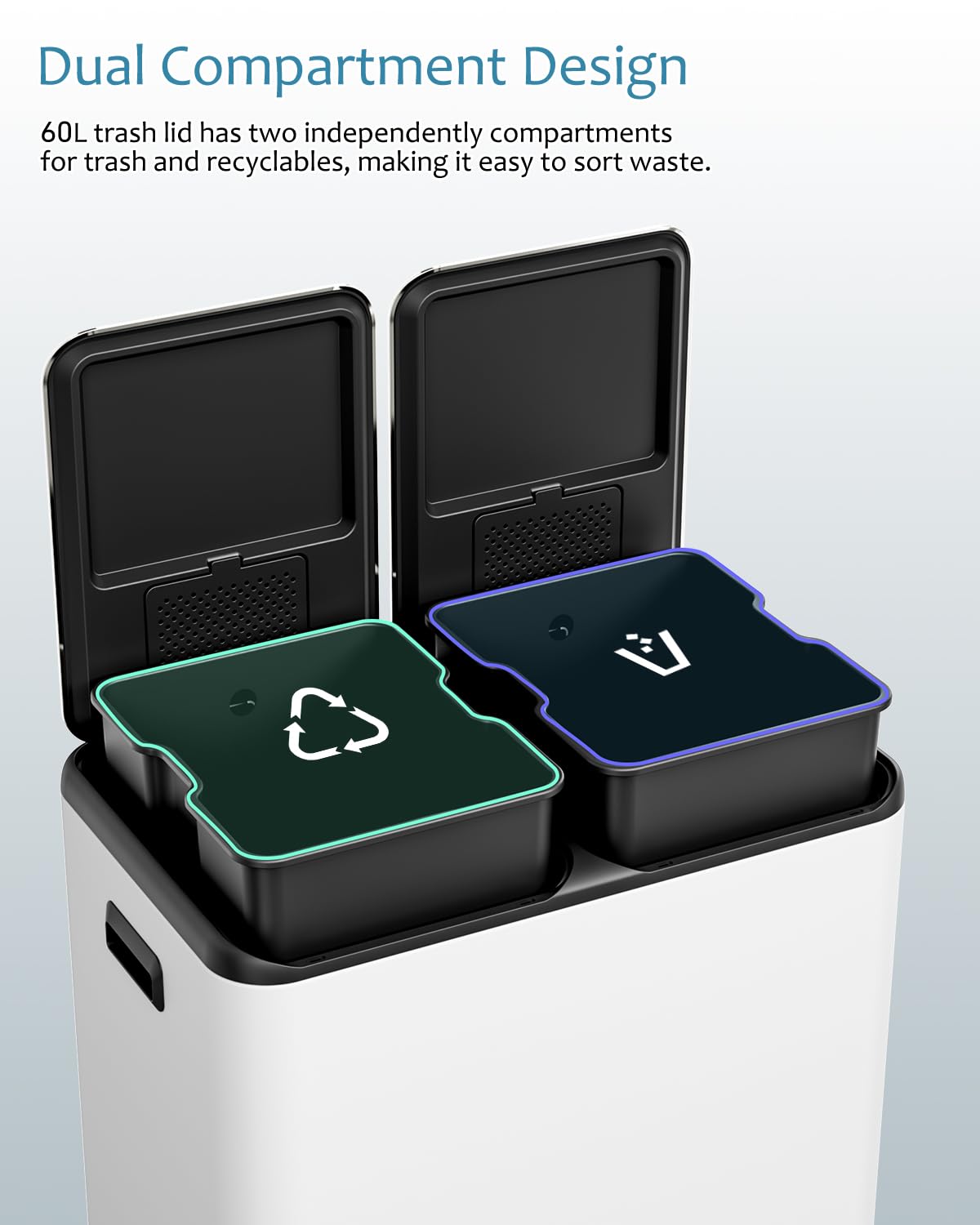 • 2 Removable Inner Buckets: Dual compartment trash can offers separate bins for different types of waste. Each compartment has its lid, which allows you to sort waste efficiently. With a generous capacity of 2 x 8 gallons, combo garbage bin meets your daily needs