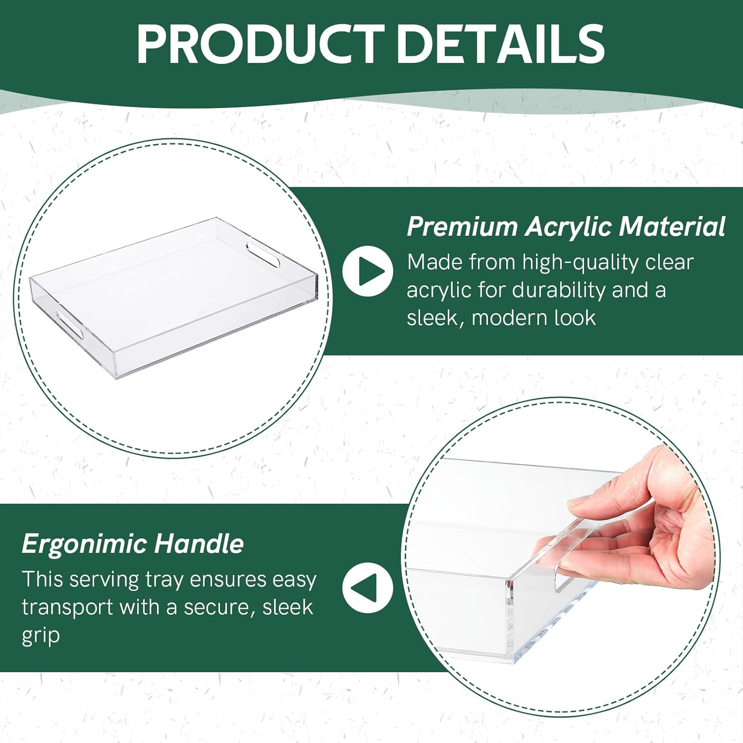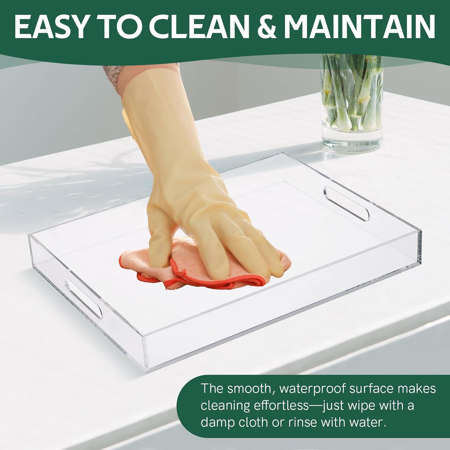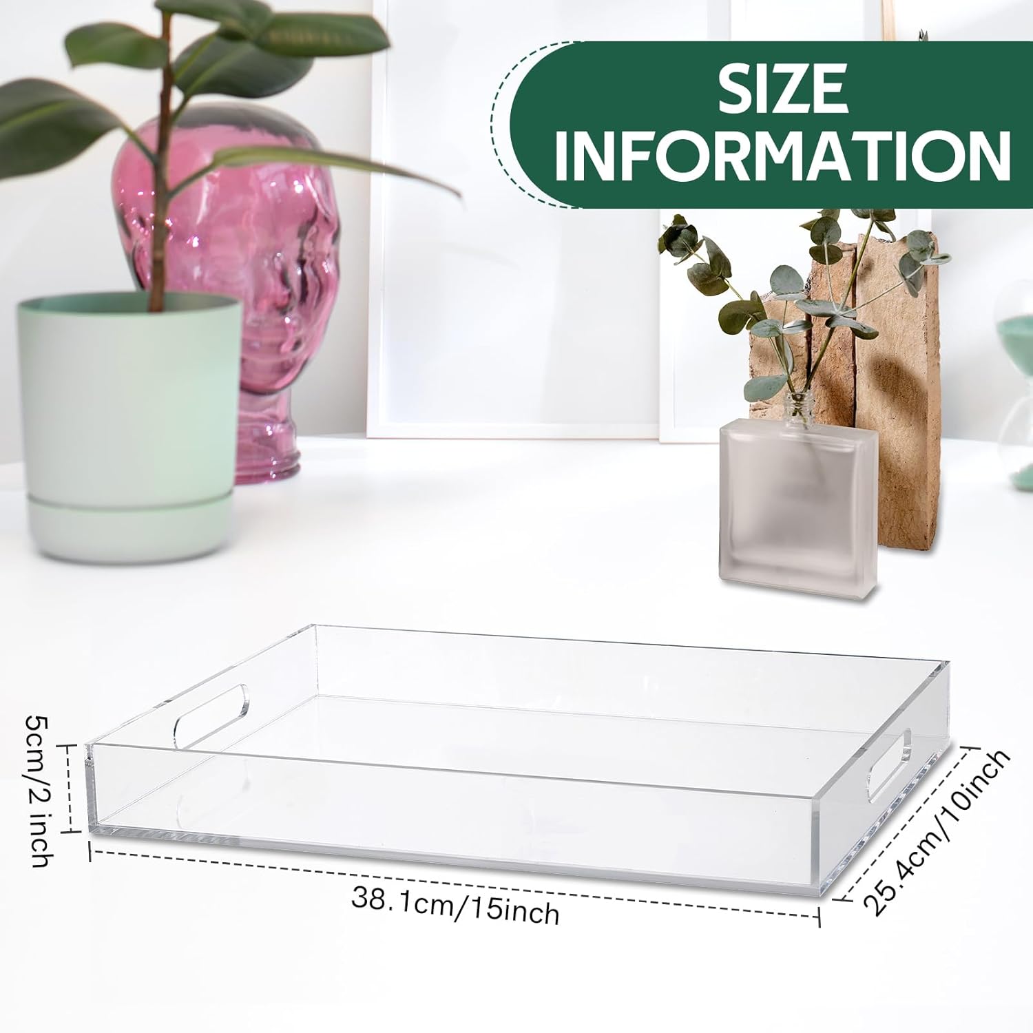 • Durable & Stylish Acrylic Tray – Crafted from 5mm thick premium acrylic, this 15" x 10" x 2" serving tray is sturdy, lightweight, and shatter-resistant. The crystal-clear design adds a modern, elegant touch to any space, perfect for home or office use.The polished smooth edges provide a safe and comfortable grip, making it both stylish and practical.
