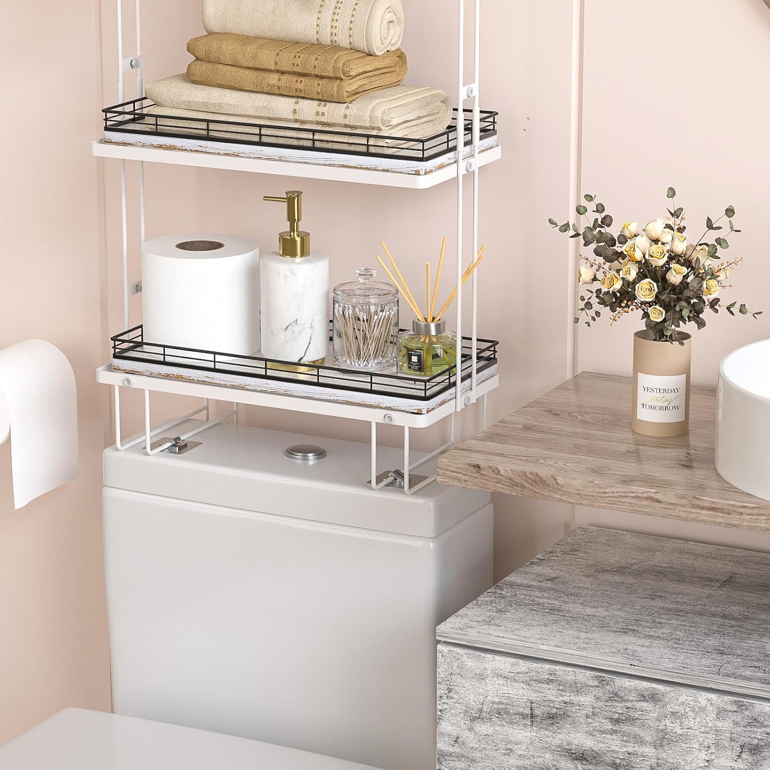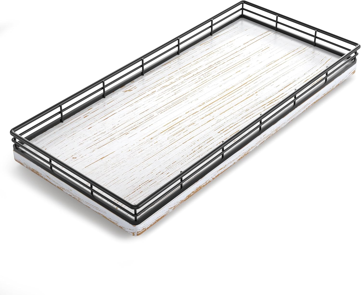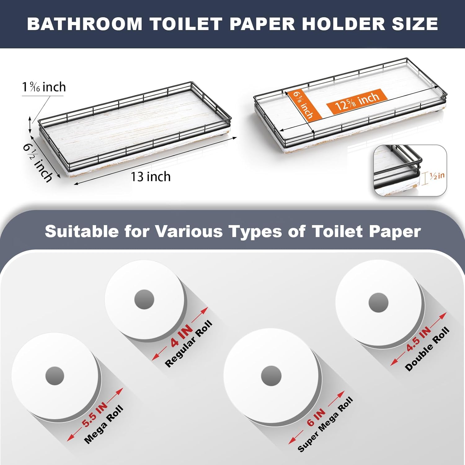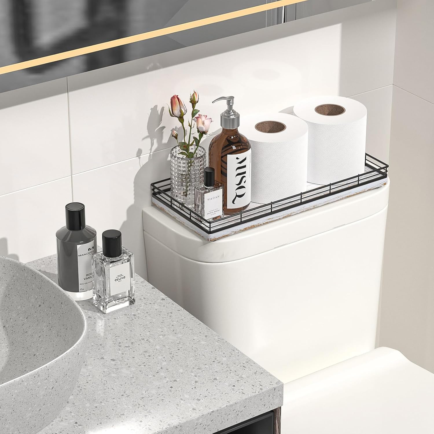 • Unique Charm: This 13 inches large wood rectangle toilet tank tray ensures durability and increased load-bearing capacity; Elevate your space with a unique appearance featuring a combination of iron mesh edges and farmhouse white wood board; Distinctive and captivating grain pattern adds an exquisite touch of elegance and sophistication; This bathroom toilet organizer tray blends modern minimalism with farmhouse charm seamlessly