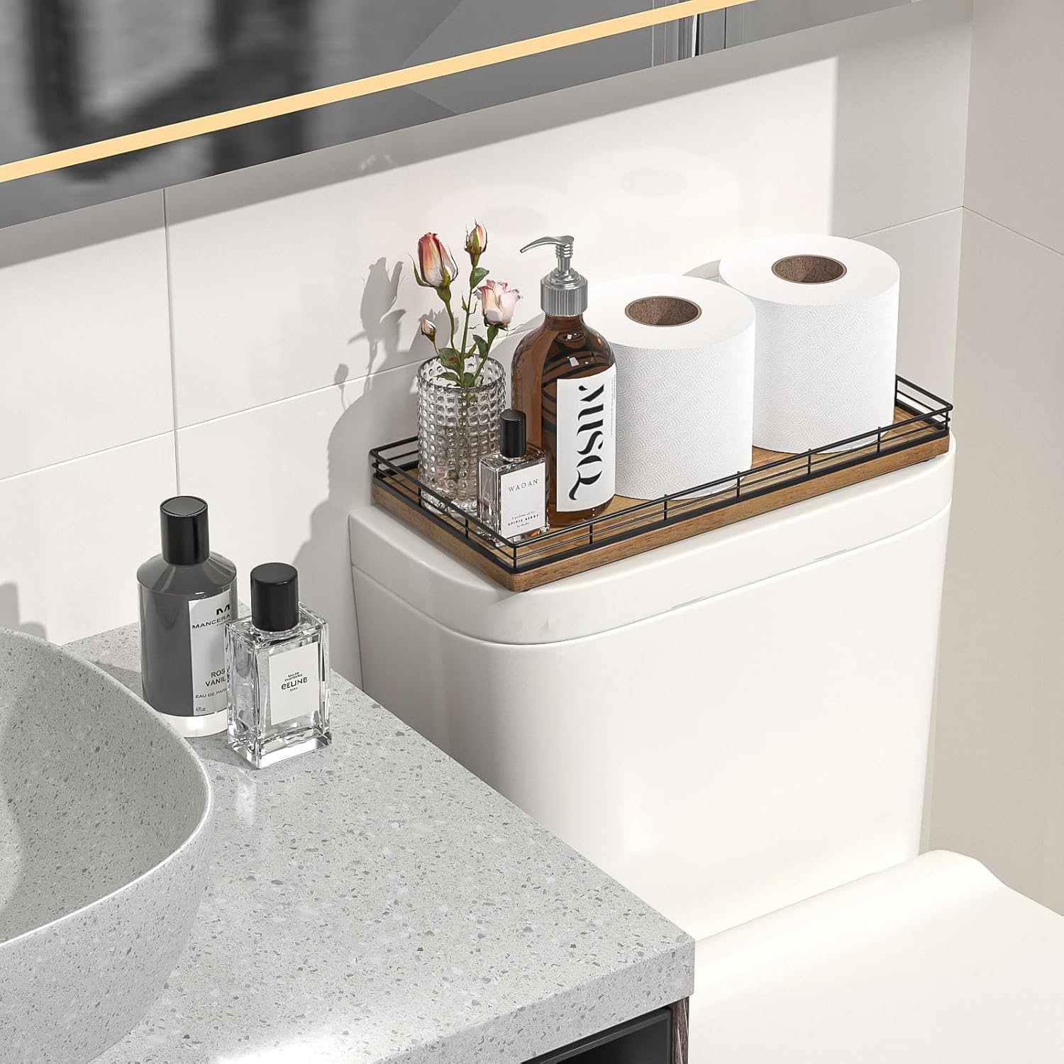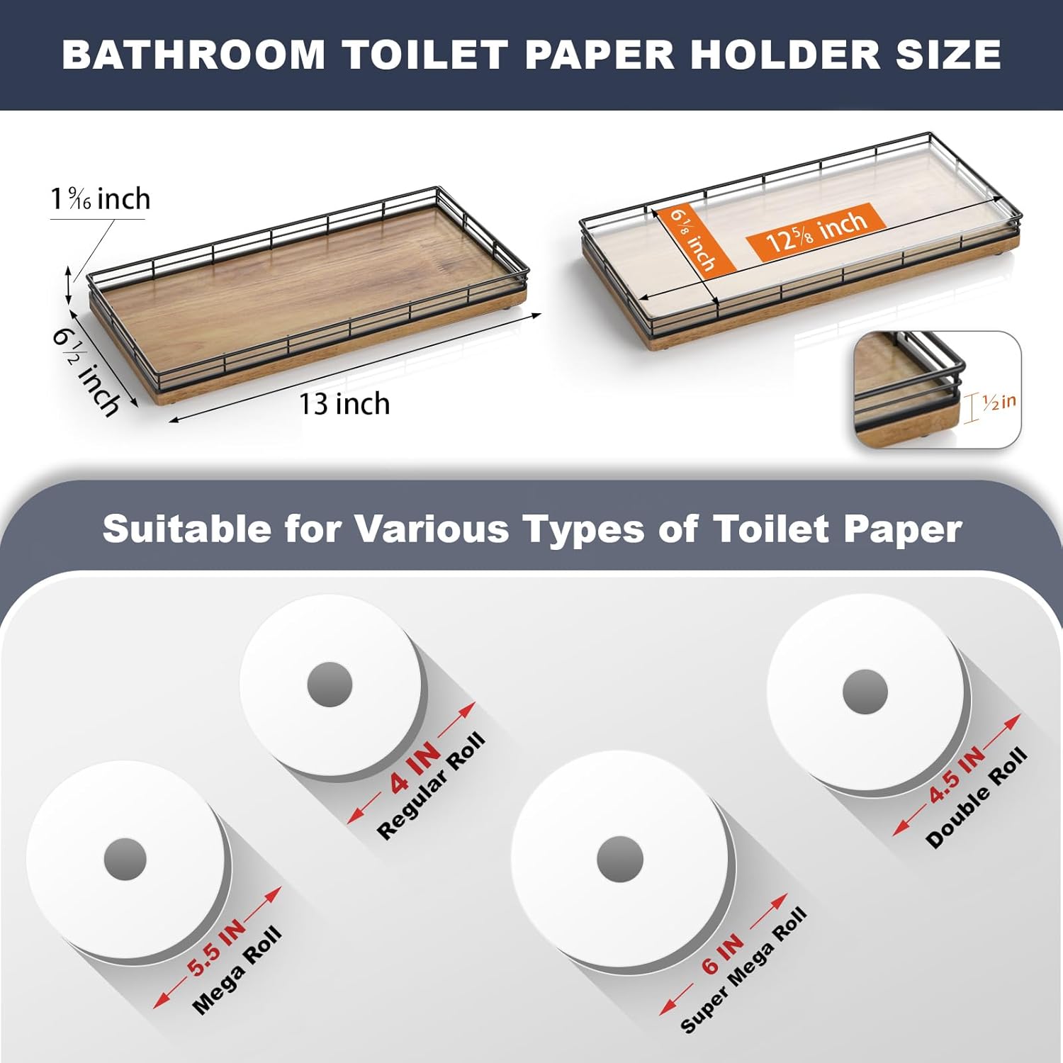 • Unique Charm: This 13 inches large wood rectangle toilet tank tray ensures durability and increased load-bearing capacity; Elevate your space with a unique appearance featuring a combination of iron mesh edges and Farmhouse brown wood board; Distinctive and captivating grain pattern adds an exquisite touch of elegance and sophistication; This bathroom toilet organizer tray blends modern minimalism with farmhouse charm seamlessly
