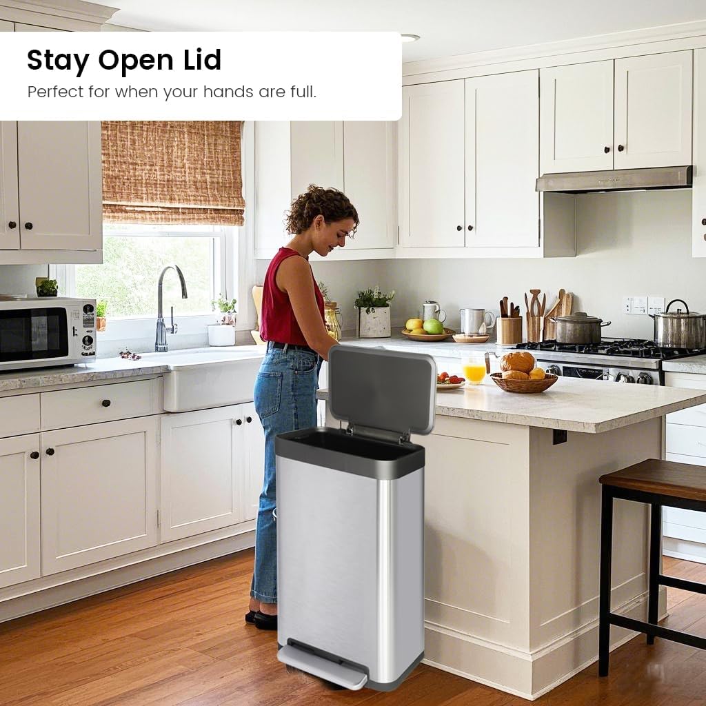• Stay-Open & Soft-Close Lid – The 13 gallon step trash can offers hands-free operation and a quiet-close mechanism.