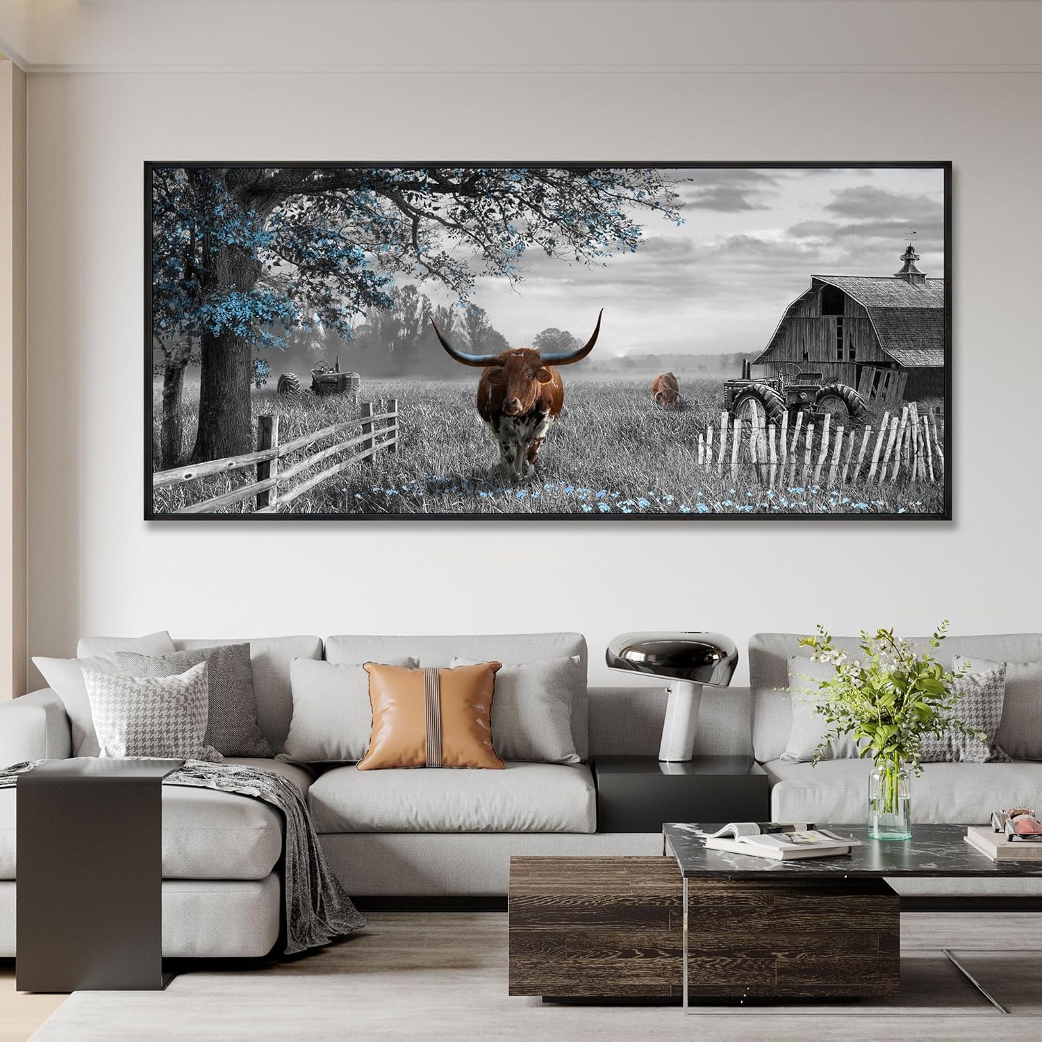 yiijeah Rustic Wall Art - Western Home Decor Cow Picture Extra Large Wall Decr Rustic Longhorn Living Room Bedroom Canvas Framed Artwork Farmhouse Decor