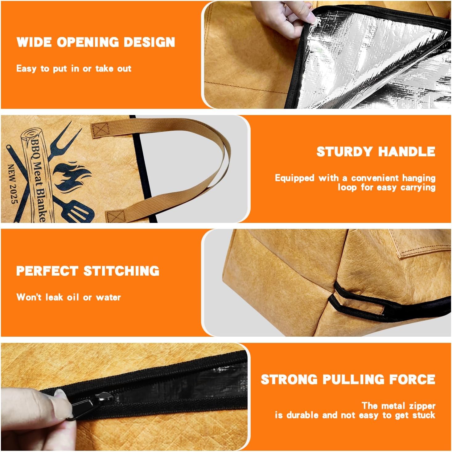 • 【Easy to carry】bbq blanket for resting meat bag is lightweight, durable and easy to fold, making it perfect for carrying around. It can prevent leakage and multiple uses, and the sturdy zipper design ensures a secure closure for easy storage and carrying. It is an ideal choice for travel and outdoor parties.