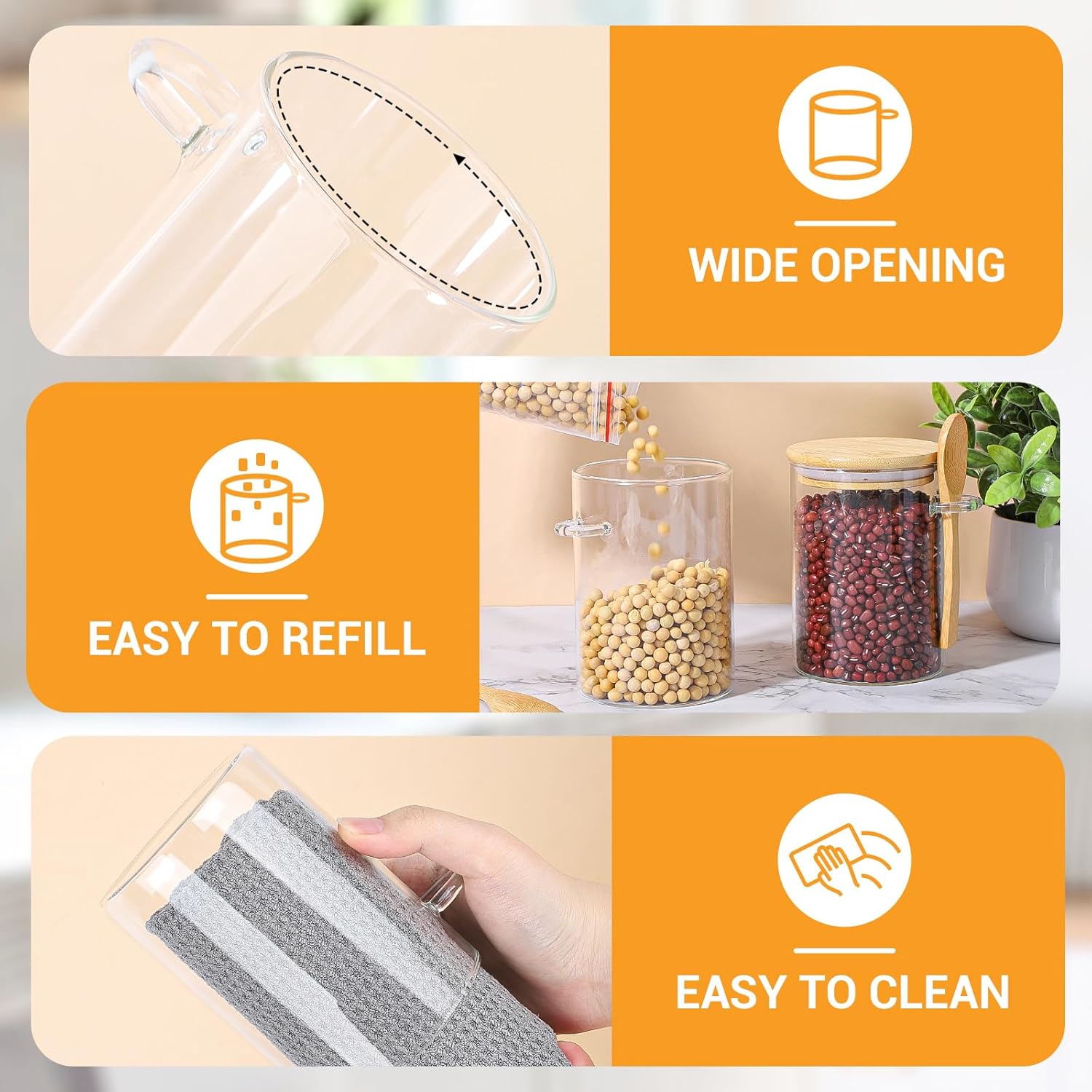 • Glass Jars with Airtight Lid: Each tea container features an airtight bamboo lid with silicone seal bamboo lid, keeps your food fresh and safe from moisture and dust. The matching wooden spoons are convenient for scooping food. In addition, the glass canister is designed with a small handle on the side, allowing you to conveniently place the spoons, keeping everything organized and easy to access.