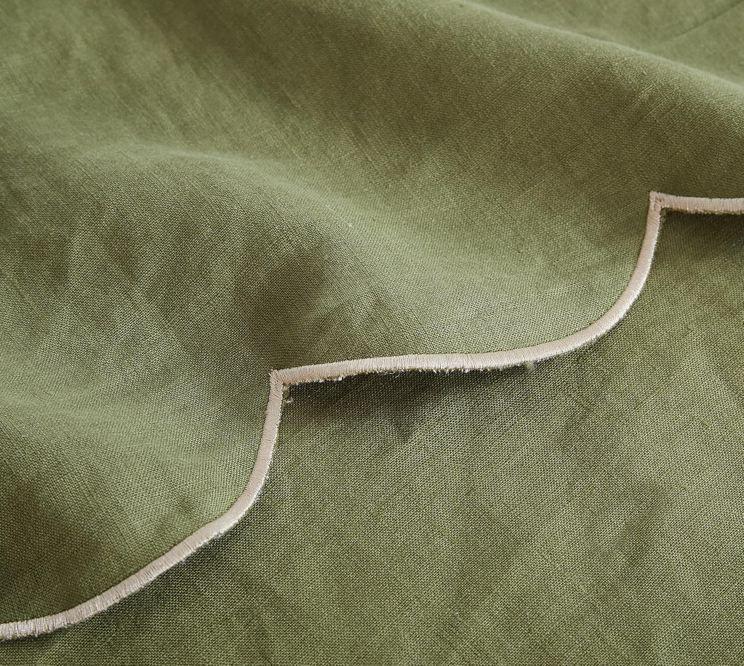 100% French Flax Linen Tablecloths Scalloped Embroidery Rectangle 84Lx60W Inch for Dinners, Parties, Spring, Easter, Machine Washable, 6-8 Sets, Olive Green(Edges-Gold)