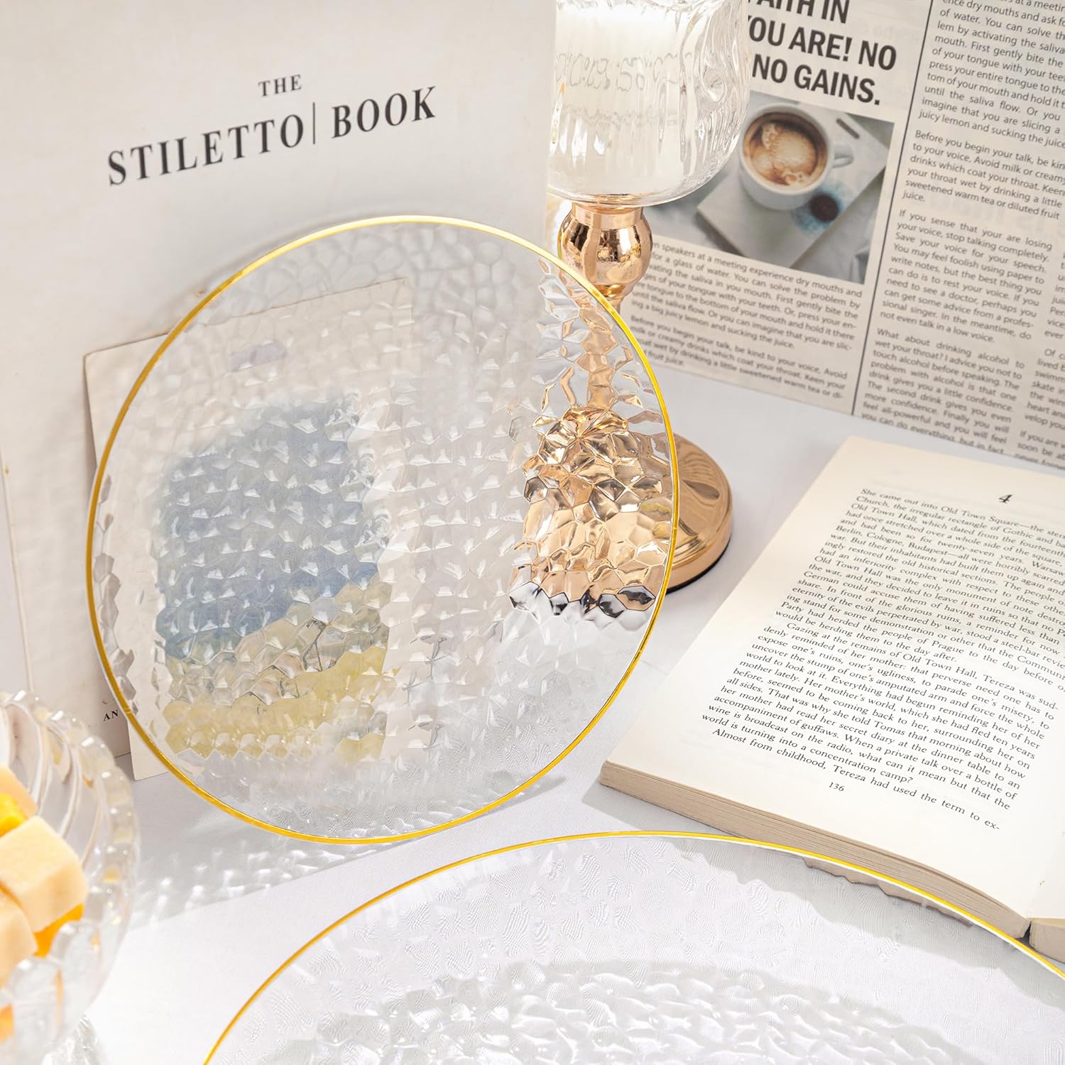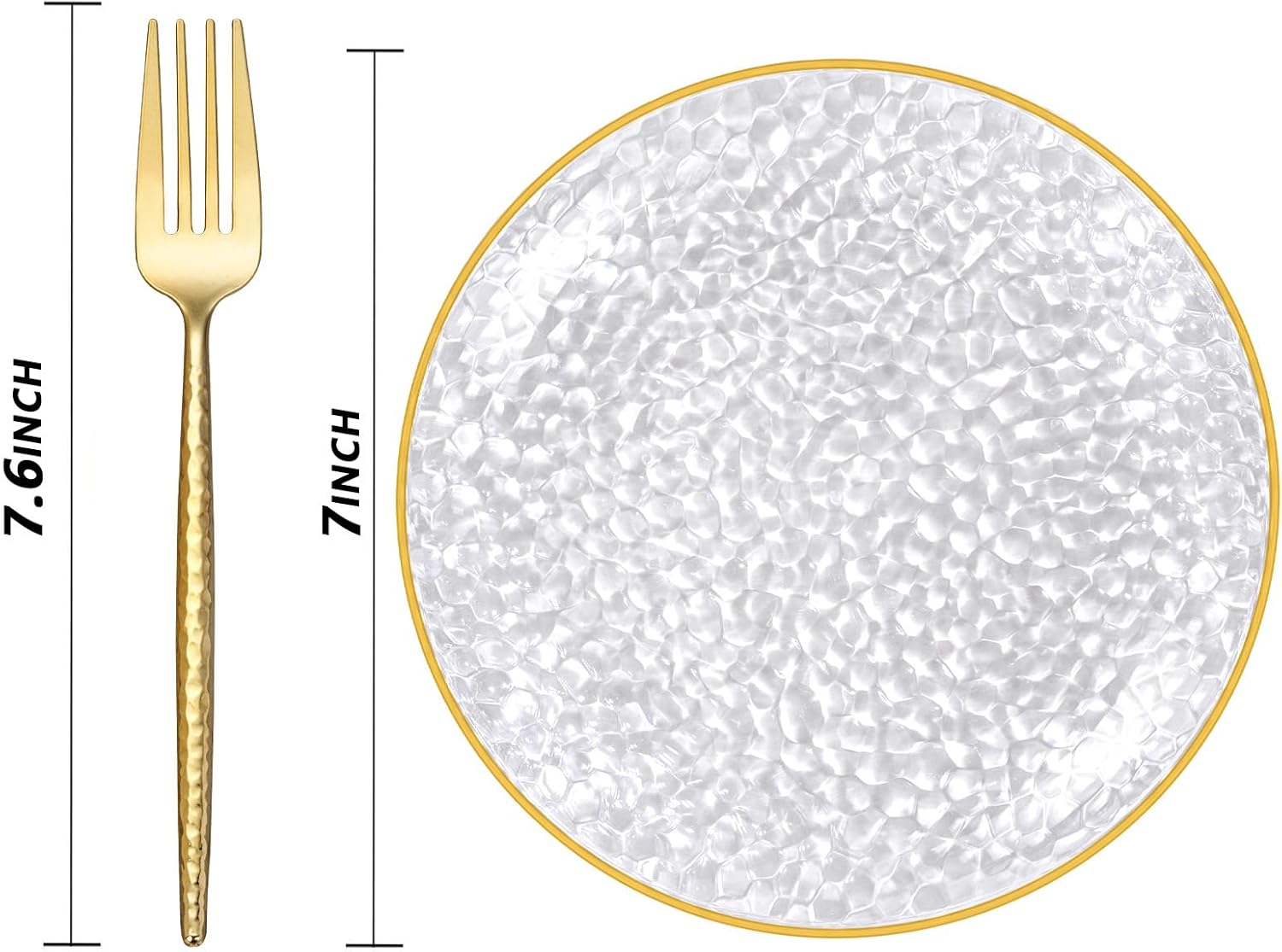Rubtlamp 200 Pcs Clear Gold Dessert Plates 7" with Forks 7.6",Clear Plastic Hammered Platos, Dessert Plates Disposable, Heavy Duty Party Platos Include 100platos and 100forks for Party&Birthday