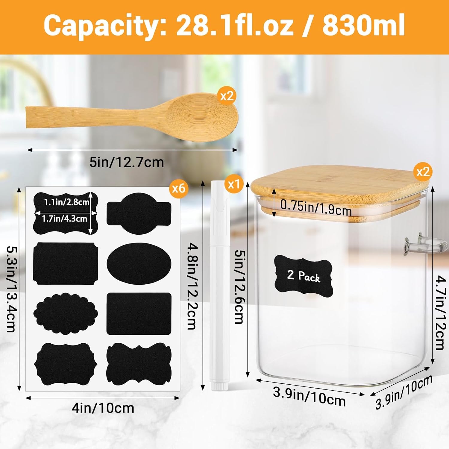 • Square Canister Set Pack of 2: Kimqi food jars set includes 2 pack 28 fl.oz / 830ml glass storage jars with wood lids and spoon, each jar with a size of 4.7 x 3.9 inch (12cm x 10cm). The set also comes with 48 blank labels and 1 chalk marker for easy customization, which is great for pantry storage jar or kitchen countertop organization.