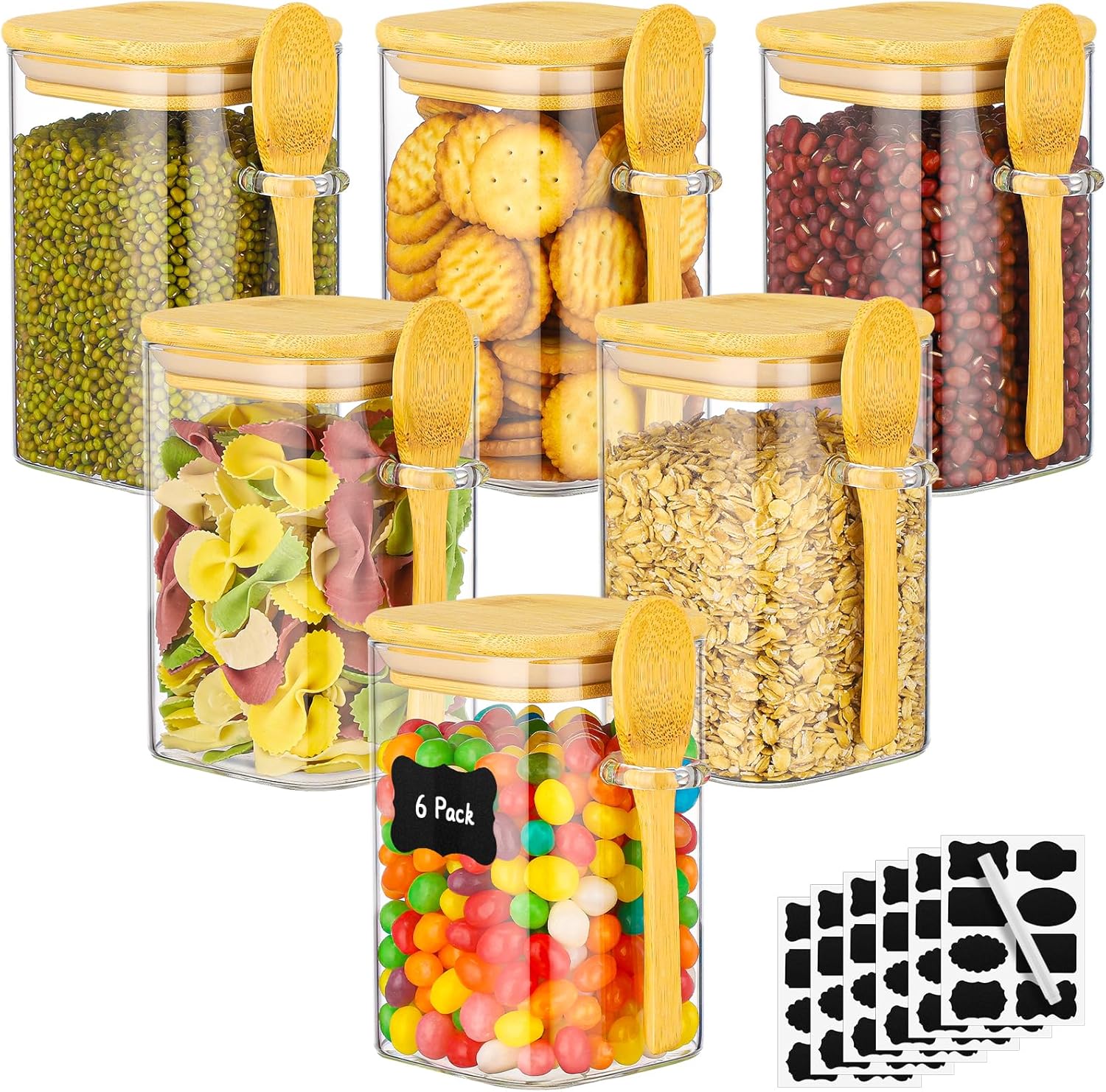 Glass Jars with Bamboo Lids and Spoons - 6 Pack 18 Fl.oz Square Glass Containers Set, Includes Labels and Marker, Clear Pantry Storage Container for Sugar, Coffee Bean, Flour, Tea, Cookies, Nuts