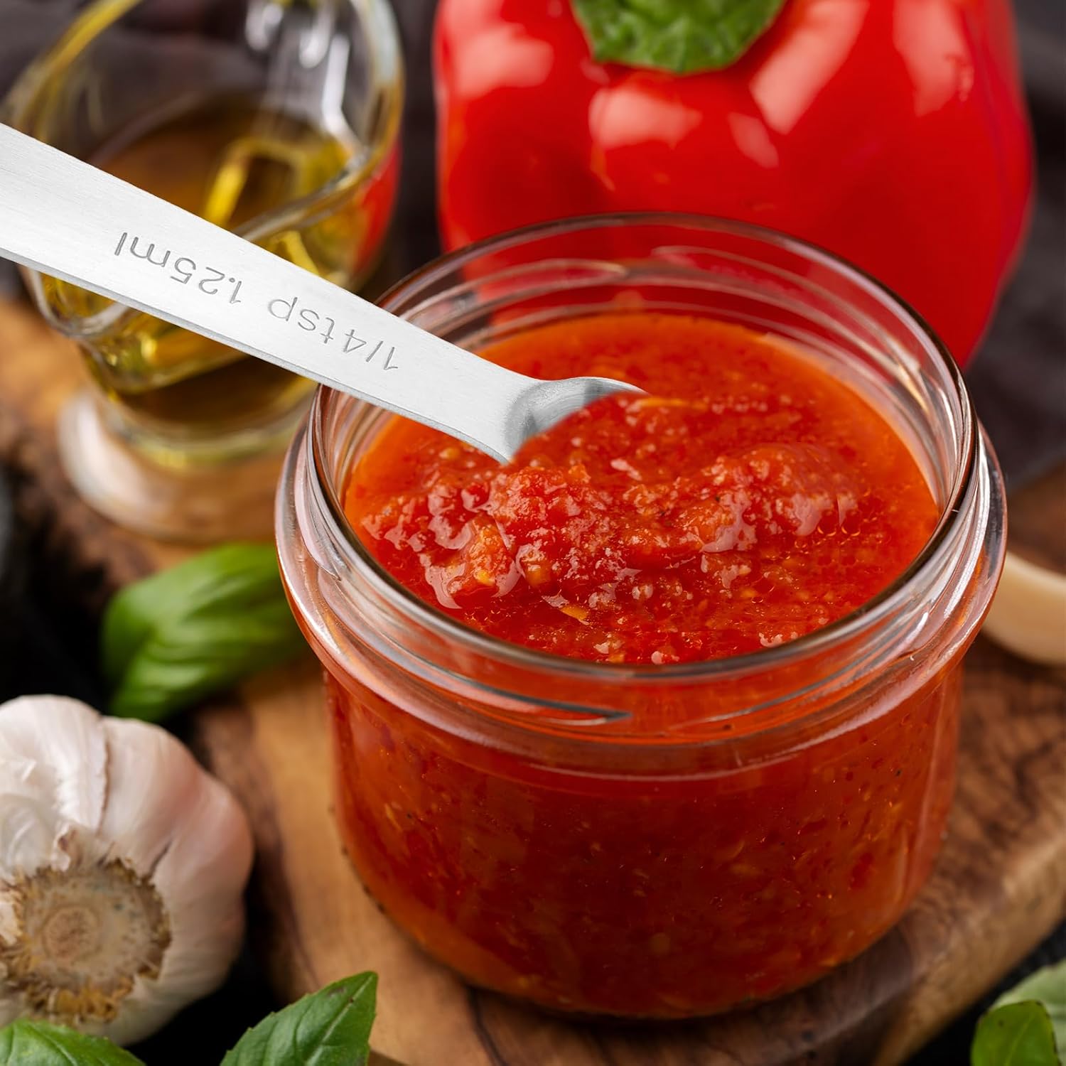• 【Thoughtful Design】Our 1/4 tsp measuring spoon is thoughtfully designed, combining the essence of the cup-shaped round head design and the long handle design. This allows the small measuring spoons to easily penetrate into spice jars and other small containers, effectively overcoming the problem of spice spillage and spoon storage, bringing you an unprecedented convenient experience