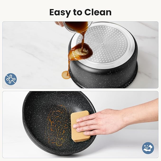 • Granite Non-Stick Coating - The cookware set promises easy and effortless cleaning. The unique granite material prevents food from sticking to the surface, reducing the need for oil and making your meals healthier and clean-up faster