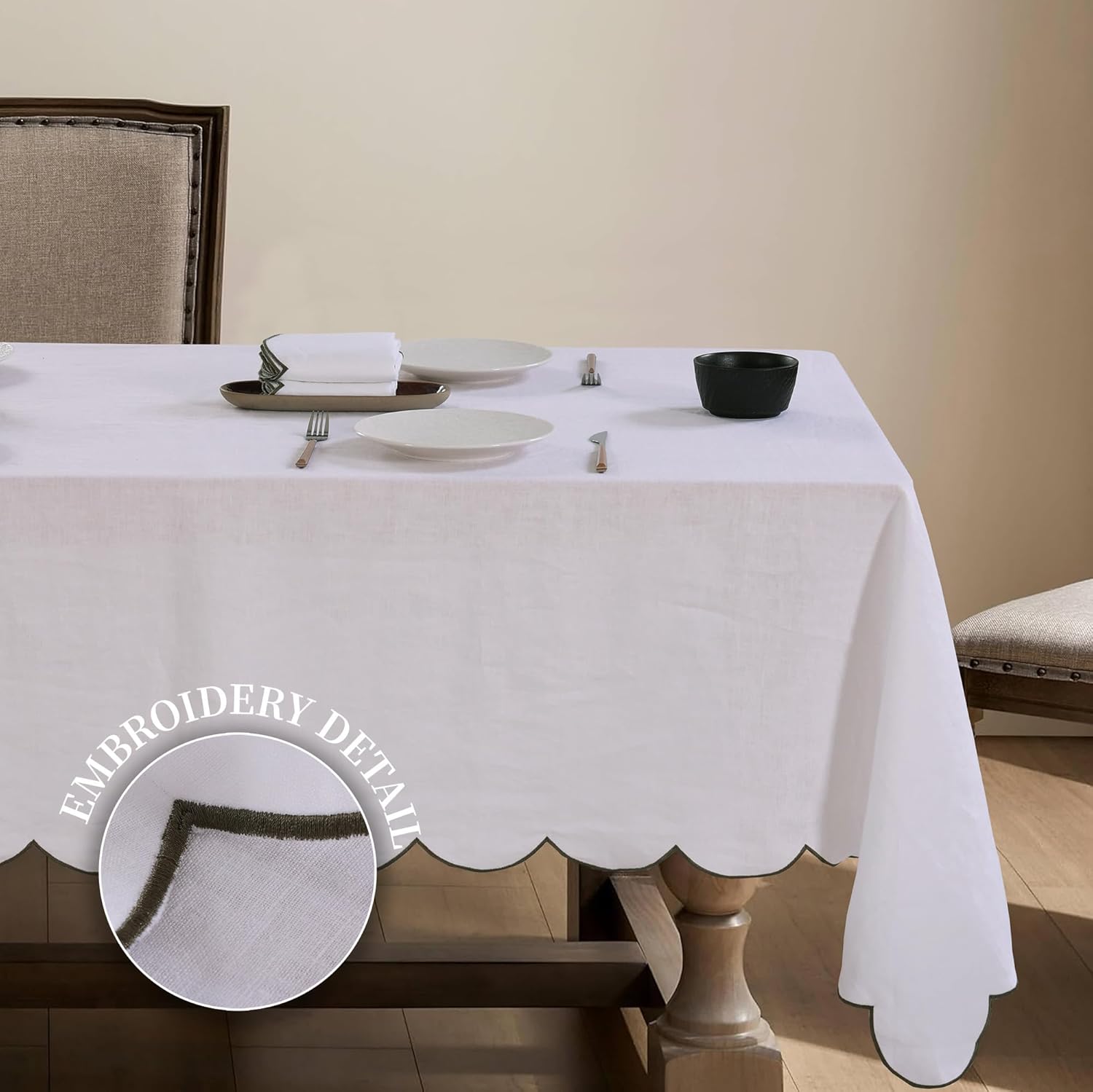 100% French Flax Linen Tablecloths Scalloped Embroidery Rectangle 120Lx60W Inch for Dinners, Parties, Spring, Machine Washable, 10-12 Sets, White(Edges-Green)