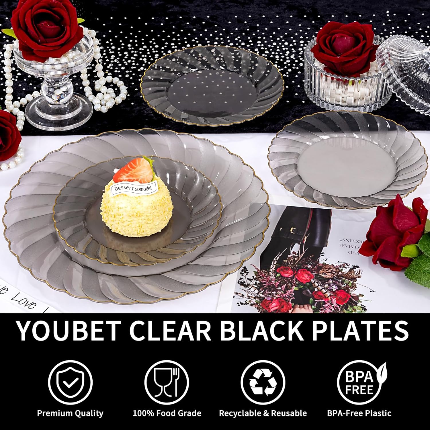 YOUBET 125PCS Clear Black Plastic Plates - Black and Gold Disposable Plates Include 50 Plate, 75 Silverware for Wedding & Party & Birthday & Halloween