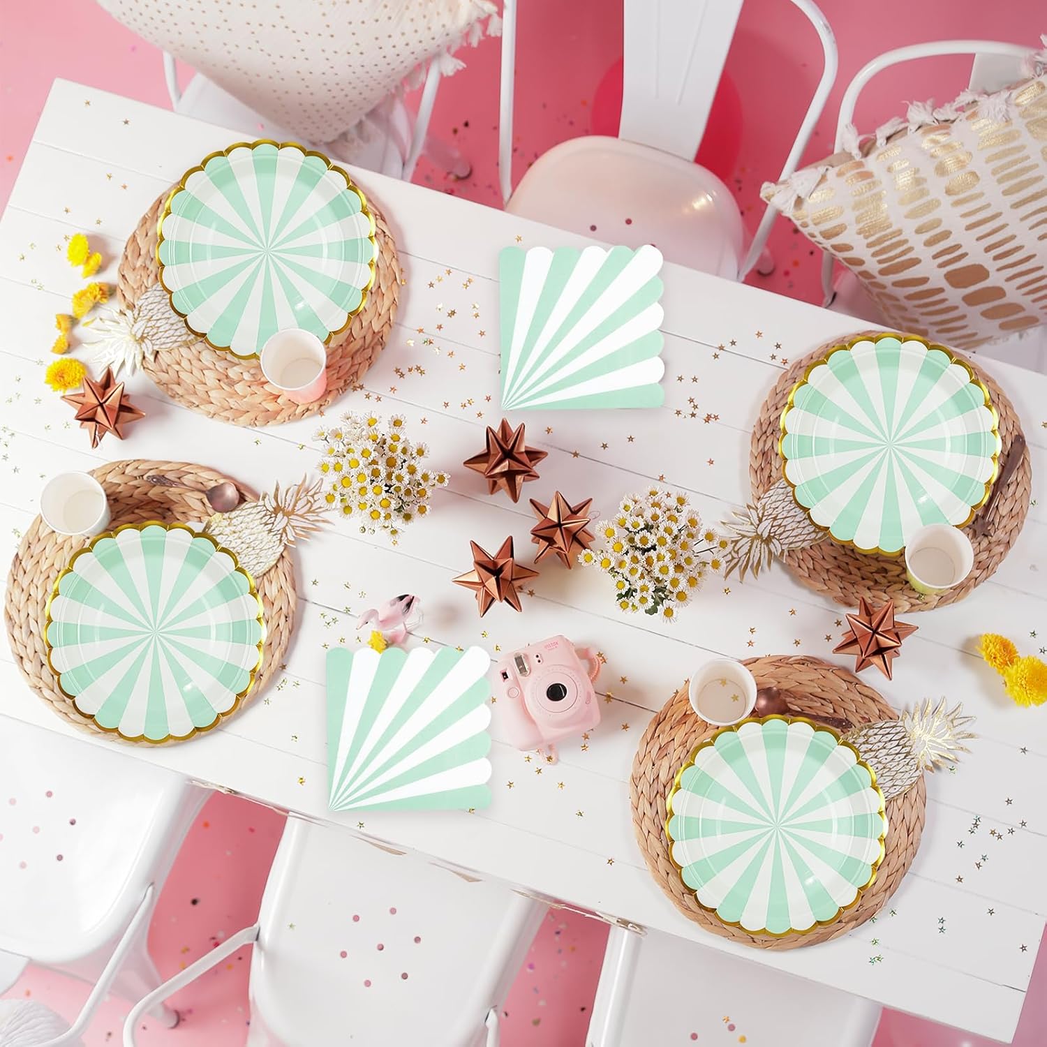72PCS Sage Green Paper Plates and Napkins Party Supplies, Gold Foil Edge Scalloped Striped Plates Napkins Disposable Tableware Set for Birthday Wedding Baby Shower Party Decoration (Green)