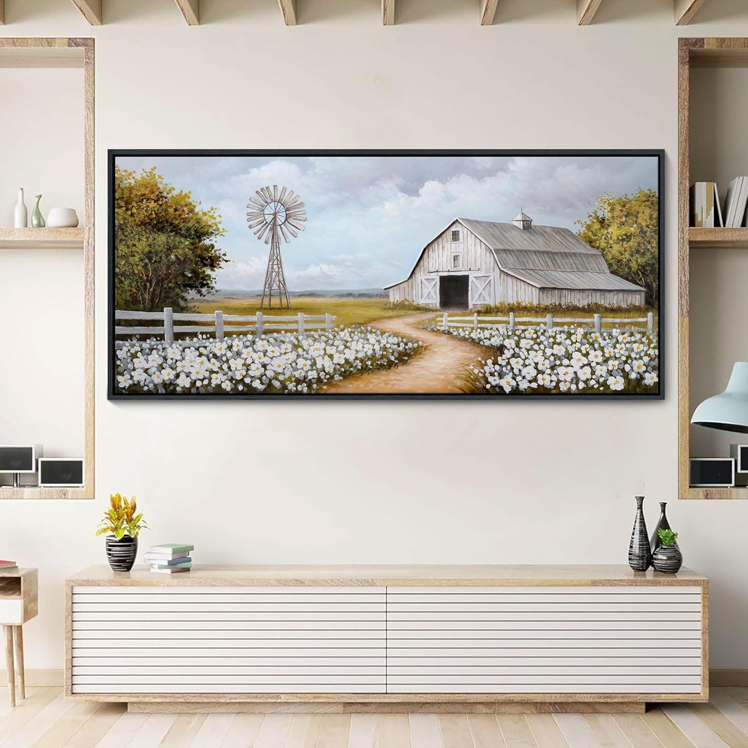 YCPRIMER Extra Large Farmhouse Wall Art Vintage Classical Painting Rustic Countryside Wildflower Field Nature Meadow Landscape Yellow Wall Decor Retro Windmill Barn Canvas Print Wilderness Artwork for Bedroom Living Room 70x31inchs