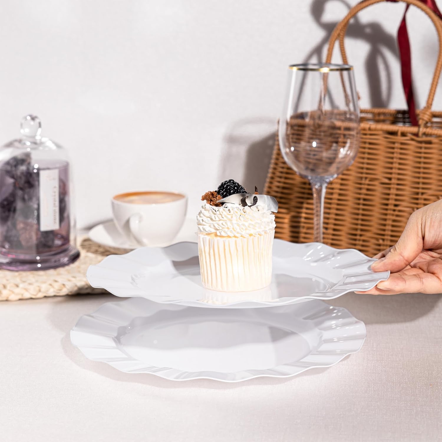 • Elegant design: Delicate wavy edge design dinnerware, simple and luxurious, look like chinaware, which can be paired with any style cutlery, suitable for all party occasions. High quality plastic cutlery is not easy to bend, hand washed and reused.