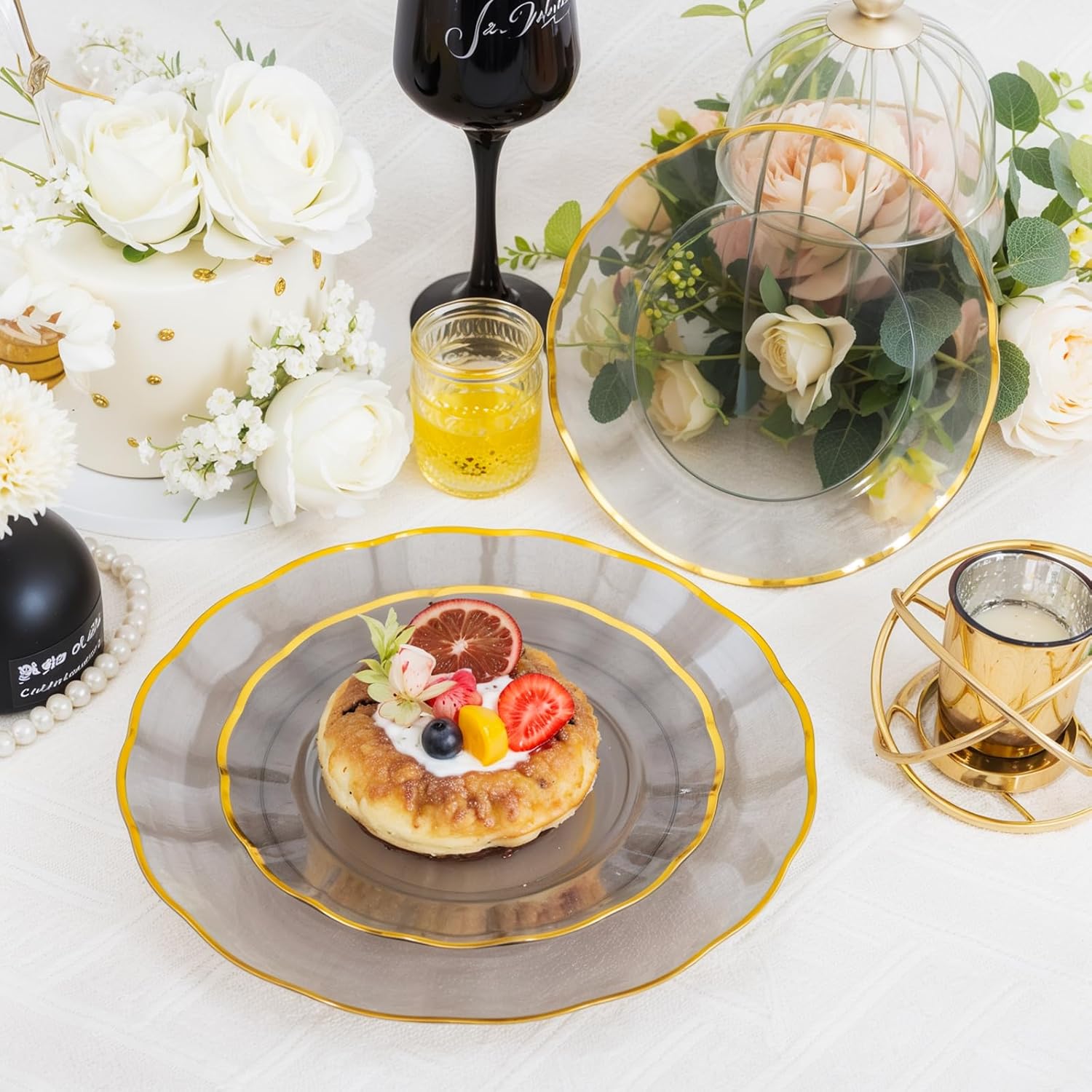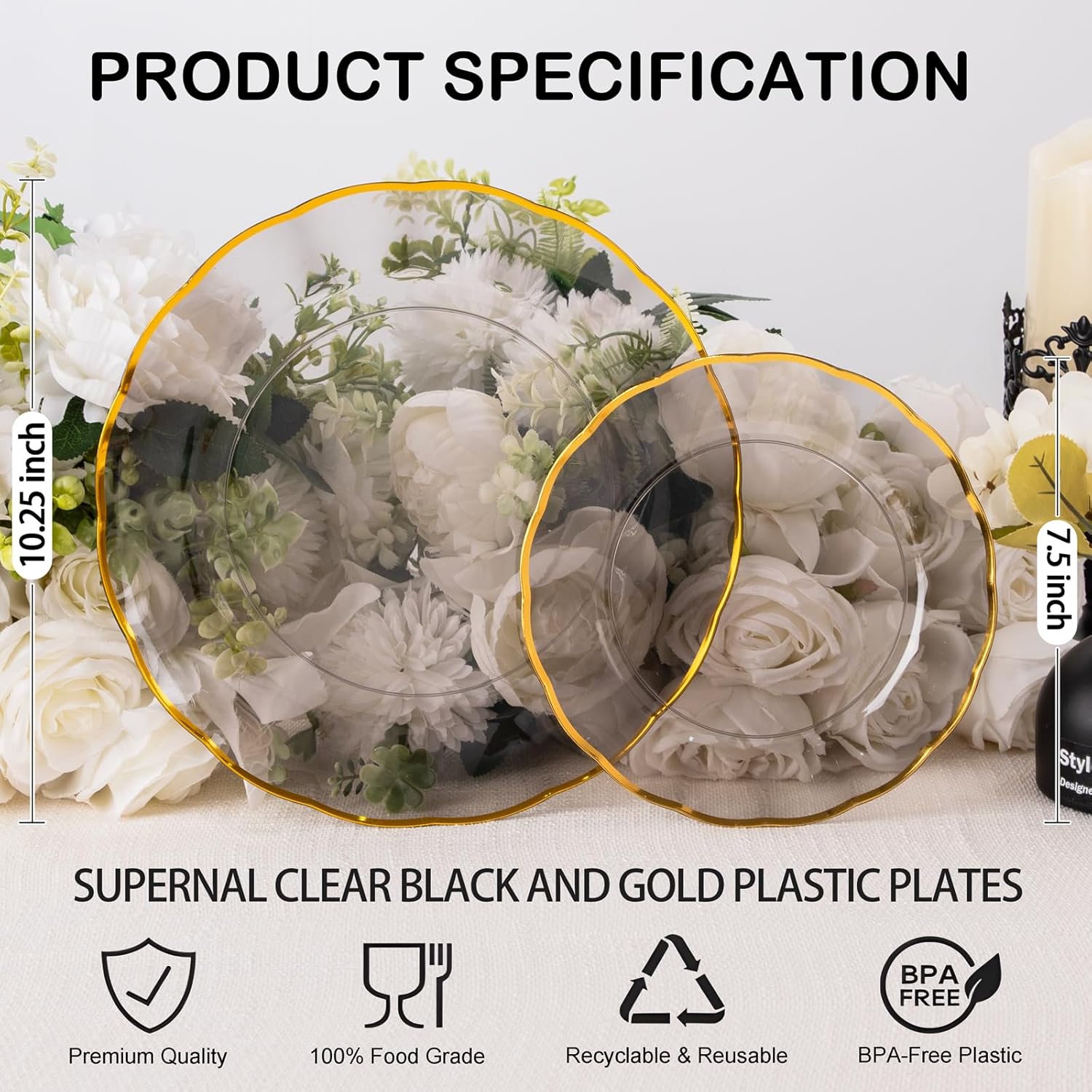 • Elegant Ruffled Design:The gold and black plastic plates is crystal clear design highlights the vibrant colors of dishes,and is also more diverse than plain clear plates,while the unique scalloped edges adds a touch of beauty to your dining table,which is the perfect choice for parties and weddings.With a classical gold trim and an elegant black and gold plates,elegant plastic plates exude timeless sophistication.